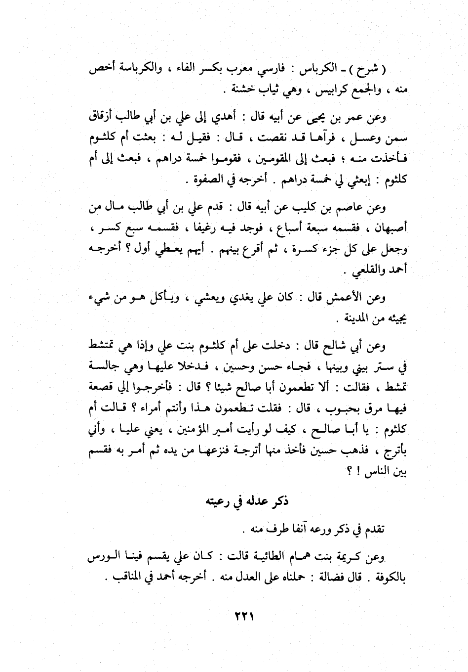 وعن كريمة بنت همام الطائية قالت: كان علي يقسم فينا الورس بالكوفة. قال فضالة: حملناه على العدل منه. أخرجه أحمد في المناقب.