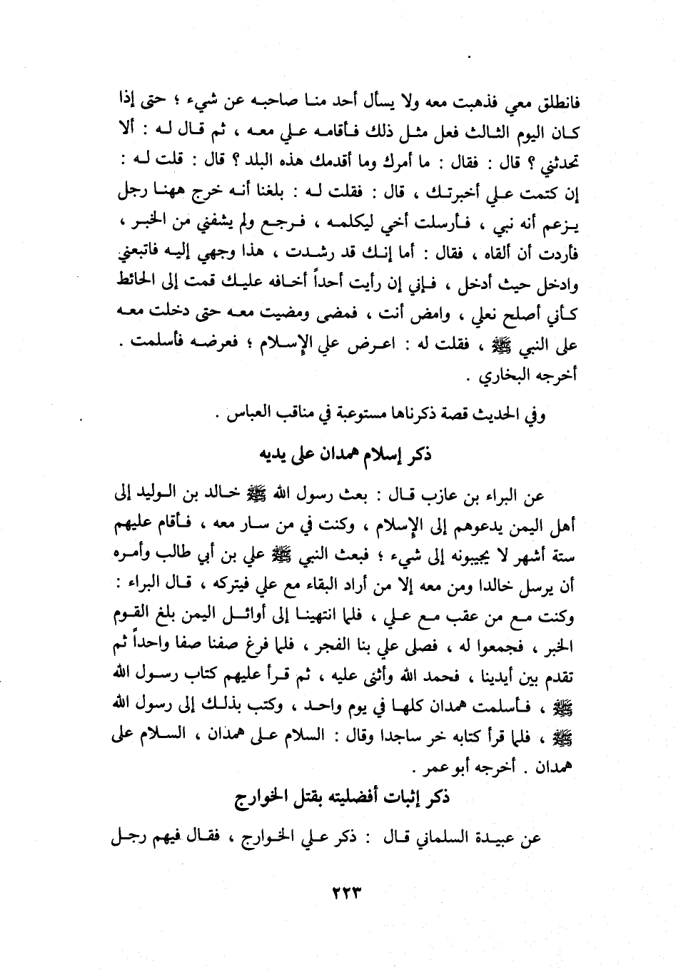 عن البراء بن عازب قال: بعث رسول الله -صلى الله عليه وسلم- خالد بن الوليد إلى أهل اليمن يدعوهم إلى الإسلام، وكنت فيمن سار معه، فأقام عليهم ستة أشهر لا يجيبونه إلى شيء؛ فبعث النبي -صلى الله عليه وسلم- علي بن أبي طالب, وأمره أن يرسل خالدا ومن معه إلا من أراد البقاء مع علي فيتركه، قال البراء: وكنت مع من عقب مع علي، فلما انتهينا إلى أوائل اليمن بلغ القوم الخبر، فجمعوا له، فصلى علي بنا الفجر، فلما فرغ صفنا صفًّا واحدًا ثم تقدم بين أيدينا، فحمد الله وأثنى عليه، ثم قرأ عليهم كتاب رسول الله -صلى الله عليه وسلم- فأسلمت همدان كلها في يوم واحد، وكتب بذلك إلى رسول الله -صلى الله عليه وسلم- فلما قرأ كتابه خرَّ ساجدًا وقال: "السلام على همدان، السلام على همدان" أخرجه أبو عمر.