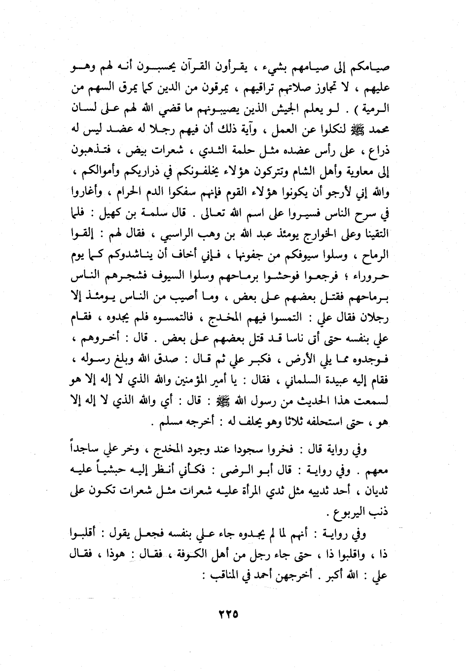 صيامكم إلى صيامهم بشيء، يقرءون القرآن يحسبون أنه لهم وهو عليهم، لا تجاوز صلاتهم تراقيهم، يمرقون من الدين كما يمرق السهم من الرمية" لو يعلم الجيش الذين يصيبونهم ما قضى الله لهم على لسان محمد -صلى الله عليه وسلم- لنكلوا عن العمل، وآية ذلك أن فيهم رجلا له عضد ليس له ذراع، على رأس عضده مثل حلمة الثدي، شعرات بيض، فتذهبون إلى معاوية وأهل الشام وتتركون هؤلاء يخلفونكم في ذراريكم وأموالكم، والله إني لأرجو أن يكونوا هؤلاء القوم فإنهم سفكوا الدم الحرام، وأغاروا في سرح الناس فسيروا على اسم الله تعالى. قال سلمة بن كهيل: فلما التقينا وعلى الخوارج يومئذ عبد الله بن وهب الراسبي، فقال لهم: القوا الرماح، وسلوا سيوفكم من جفونها، فإني أخاف أن يناشدوكم كما يوم حروراء؛ فرجعوا فوحشوا برماحهم وسلوا السيوف فشجرهم الناس برماحهم فقتل بعضهم على بعض، وما أصيب من الناس يومئذ إلا رجلان فقال علي: التمسوا فيهم المخدج، فالتمسوه فلم يجدوه، فقام علي بنفسه حتى أتى ناسا قد قتل بعضهم على بعض. قال: أخروهم، فوجدوه مما يلي الأرض، فكبر علي ثم قال: صدق الله وبلغ رسوله، فقام إليه عبيدة السلماني، فقال: يا أمير المؤمنين والله الذي لا إله إلا هو لسمعت هذا الحديث من رسول الله -صلى الله عليه وسلم؟ قال: إي والله الذي لا إله إلا هو، حتى استحلفه ثلاثا وهو يحلف له. أخرجه مسلم.
