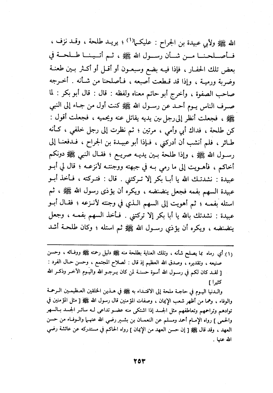 الله -صلى الله عليه وسلم- ولأبي عبيدة بن الجراح: "عليكما 1 " يريد طلحة وقد نزف، فأصلحنا من شأن رسول الله -صلى الله عليه وسلم- ثم أتينا طلحة في بعض تلك الحفار، فإذا فيه بضع وسبعون أو أقل أو أكثر بين طعنة وضربة ورمية، وإذا قد قطعت أصبعه، فأصلحنا من شأنه. أخرجه صاحب الصفوة، وأخرج أبو حاتم معناه ولفظه: قال: قال أبو بكر: لما صرف الناس يوم أحد عن رسول الله -صلى الله عليه وسلم- كنت أول من جاء إلى النبي -صلى الله عليه وسلم- فجعلت أنظر إلى رجل بين يديه يقاتل عنه ويحميه، فجعلت أقول: كن طلحة فداك أبي وأمي, مرتين؛ ثم نظرت إلى رجل خلفي كأنه طائر، فلم أنشب أن أدركني، فإذا أبو عبيدة بن الجراح فدفعنا إلى رسول الله -صلى الله عليه وسلم- وإذا طلحة بين يديه صريع؛ فقال النبي -صلى الله عليه وسلم: "دونكم أخاكم" فأهويت إلى ما رمي به في جبهته ووجنته لأنزعه؛ قال لي أبو عبيدة: نشدتك الله يا أبا بكر إلا تركتني. قال: فتركته، فأخذ أبو عبيدة السهم بفمه فجعل ينضنضه، ويكره أن يؤذي رسول الله -صلى الله عليه وسلم- ثم استله بفمه؛ ثم أهويت إلى السهم الذي في وجنته لأنزعه؛ فقال أبو عبيدة: نشدتك بالله يا أبا بكر إلا تركتني. فأخذ السهم بفمه، وجعل ينضنضه، ويكره أن يؤذي رسول الله -صلى الله عليه وسلم- ثم استله؛ وكان طلحة أشد