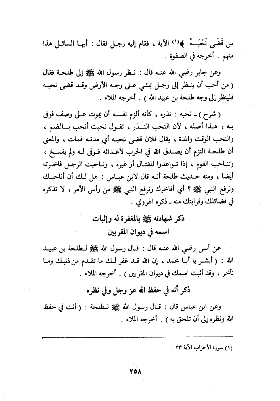 "شرح" نحبه: نذره، كأنه ألزم نفسه أن يموت على وصف فوفى به، هذا أصله؛ لأن النحب النذر، تقول: نحبت أنحب بالضم، والنحب: الوقت والمدة، يقال: فلان قضى نحبه أي: مدته فمات، والمعنى: أن طلحة التزم أن يصدق الله في الحرب لأعدائه فوفى له ولم يفسخ، وتناحب القوم: إذا تواعدوا للقتال أو غيره، وناحبت الرجل: فاخرته أيضًا، ومنه حديث طلحة أنه قال لابن عباس: هل لك أن أناحبك ونرفع النبي -صلى الله عليه وسلم? أي: أفاخرك ونرفع النبي -صلى الله عليه وسلم- من رأس الأمر، لا تذكره في فضائلك وقرابتك منه. ذكره الهروي.