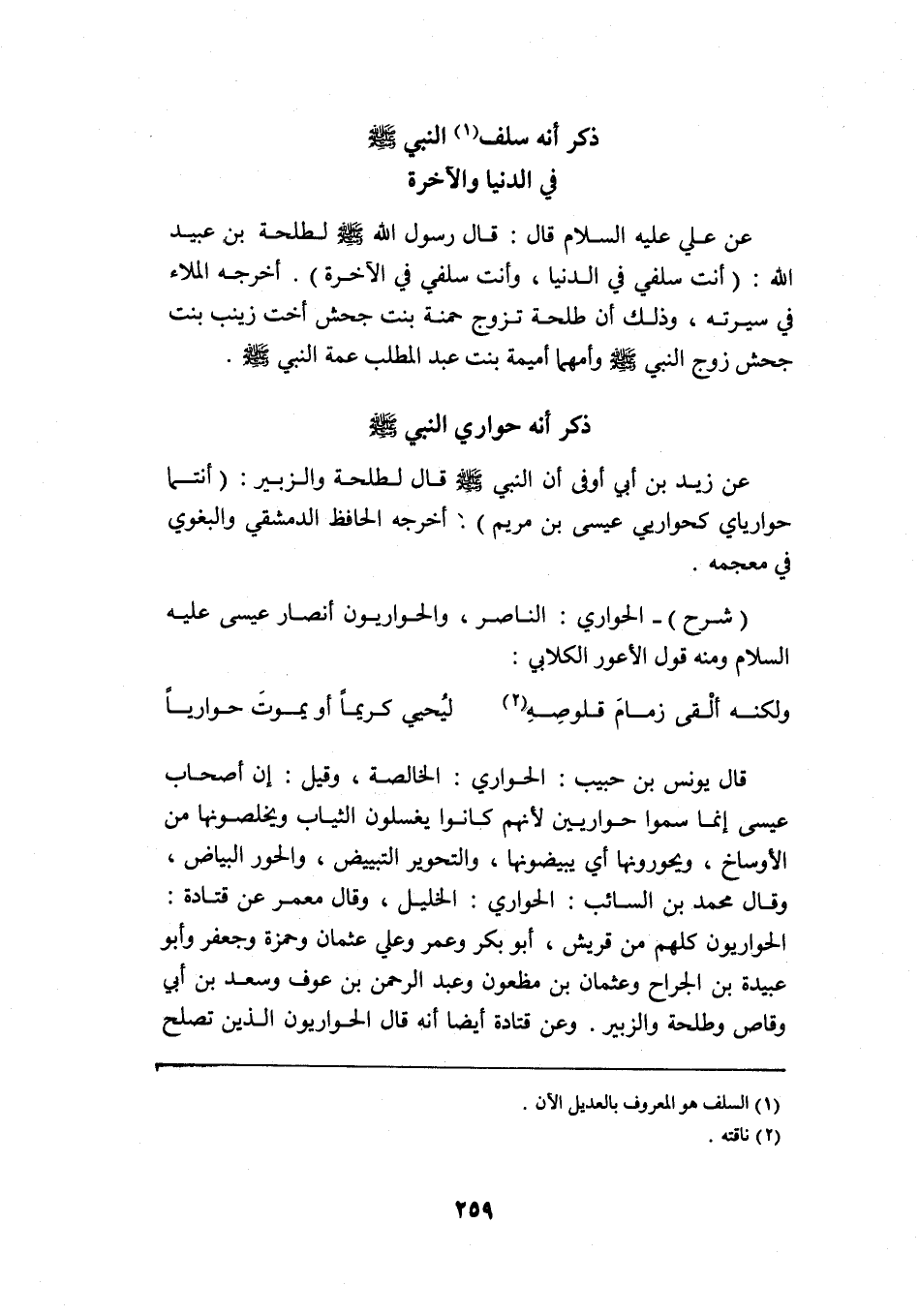 عن علي -عليه السلام- قال: قال رسول الله -صلى الله عليه وسلم- لطلحة بن عبيد الله: "أنت سلفي في الدنيا، وأنت سلفي في الآخرة" أخرجه الملاء في سيرته، وذلك أن طلحة تزوج حمنة بنت جحش أخت زينب بنت جحش زوج النبي -صلى الله عليه وسلم- وأمهما أميمة بنت عبد المطلب عمة النبي -صلى الله عليه وسلم.