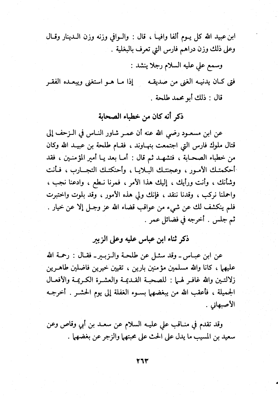عن ابن عباس -وقد سئل عن طلحة والزبير- فقال: رحمة الله عليهما، كانا والله مسلمين مؤمنين بارين، تقيين خيرين فاضلين طاهرين, زلالتين والله غافر لهما؛ للصحبة القديمة والعشرة الكريمة والأفعال الجميلة، فأعقب الله من يبغضهما بسوء الغفلة إلى يوم الحشر. أخرجه الأصبهاني.