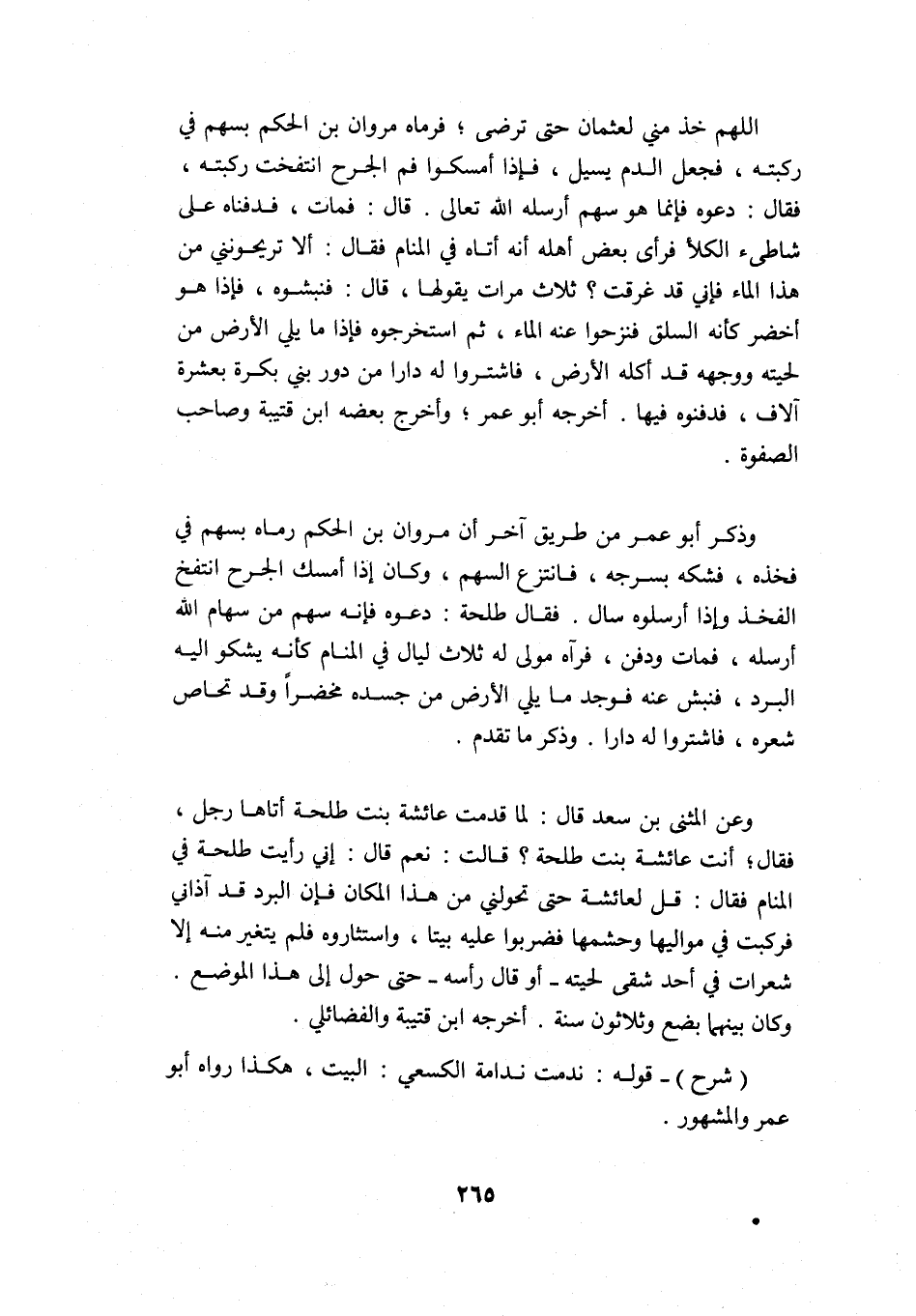 وذكر أبو عمر من طريق آخر أن مروان بن الحكم رماه بسهم في فخذه، فشكه بسرجه، فانتزع السهم، وكان إذا أمسك الجرح انتفخ الفخذ وإذا أرسلوه سال. فقال طلحة: دعوه, فإنه سهم من سهام الله أرسله، فمات ودفن، فرآه مولى له ثلاث ليال في المنام كأنه يشكو إليه البرد، فنبش عنه فوجد ما يلي الأرض من جسده مخضرا وقد تحاص شعره، فاشتروا له دارا, وذكر ما تقدم.