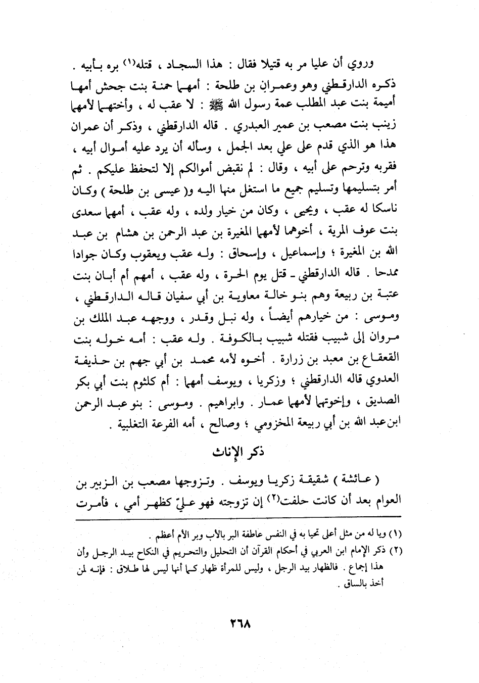 وروي أن عليا مر به قتيلا فقال: هذا السجاد، قتله1 بره بأبيه, ذكره الدارقطني. وهو وعمران بن طلحة: أمهما حمنة بنت جحش, أمها أميمة بنت عبد المطلب عمة رسول الله -صلى الله عليه وسلم- لا عقب له، وأختهما لأمهما زينب بنت مصعب بن عمير العبدري. قاله الدارقطني، وذكر أن عمران هذا هو الذي قدم على علي بعد الجمل، وسأله أن يرد عليه أموال أبيه، فقربه وترحم على أبيه، وقال: لم نقبض أموالكم إلا لتحفظ عليكم, ثم أمر بتسليمها وتسليم جميع ما استغل منها إليه و"عيسى بن طلحة" وكان ناسكا له عقب، ويحيى وكان من خيار ولده، وله عقب، أمهما سعدى بنت عوف المرية، أخوهما لأمهما المغيرة بن عبد الرحمن بن هشام بن عبد الله بن المغيرة؛ وإسماعيل، وإسحاق, وله عقب, ويعقوب وكان جوادا ممدحا قاله الدارقطني. قتل يوم الحرة، وله عقب، أمهم أم أبان بنت عتبة بن ربيعة وهم بنو خالة معاوية بن أبي سفيان قاله الدارقطني، وموسى: من خيارهم أيضًا، وله نبل وقدر، ووجهه عبد الملك بن مروان إلى شبيب فقتله شبيب بالكوفة, وله عقب, أمه خولة بنت القعقاع بن معبد بن زرارة, أخوه لأمه محمد بن أبي جهم بن حذيفة العدوي قاله الدارقطني؛ وزكريا، ويوسف أمهما: أم كلثوم بنت أبي بكر الصديق، وإخوتهما لأمهما عمار وإبراهيم وموسى بنو عبد الرحمن بن عبد الله بن أبي ربيعة المخزومي؛ وصالح, أمه الفرعة التغلبية.