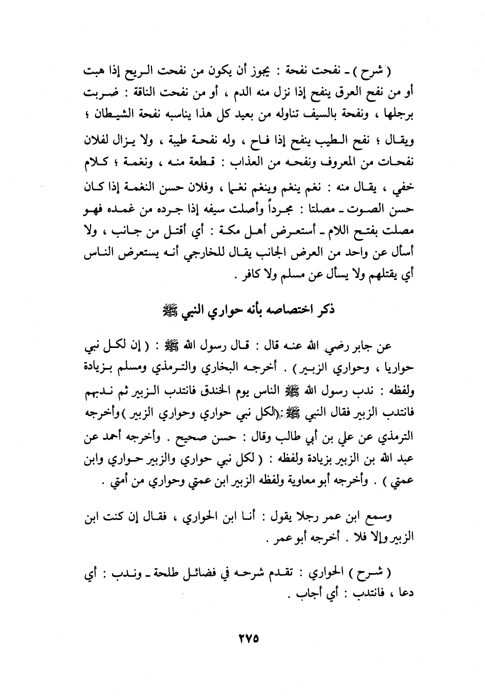 "شرح" نفحت نفحة: يجوز أن يكون من نفحت الريح إذا هبت, أو من نفح العرق ينفح إذا نزل منه الدم، أو من نفحت الناقة: ضربت برجلها، ونفحه بالسيف: تناوله من بعيد كل هذا يناسبه نفحة الشيطان؛ ويقال: نفح الطيب ينفح إذا فاح، وله نفحة طيبة، ولا يزال لفلان نفحات من المعروف, ونفحة من العذاب: قطعة منه، ونغمة: كلام خفي، يقال منه: نغم ينغم وينغم نغما، وفلان حسن النغمة إذا كان حسن الصوت, مصلتًا: مجردًا وأصلت سيفه: إذا جرده من غمده فهو مصلت بفتح اللام, أستعرض أهل مكة أي: أقتل من جانب، ولا أسأل عن واحد من العرض الجانب, يقال للخارجي: إنه يستعرض الناس أي: يقتلهم ولا يسأل عن مسلم ولا كافر.