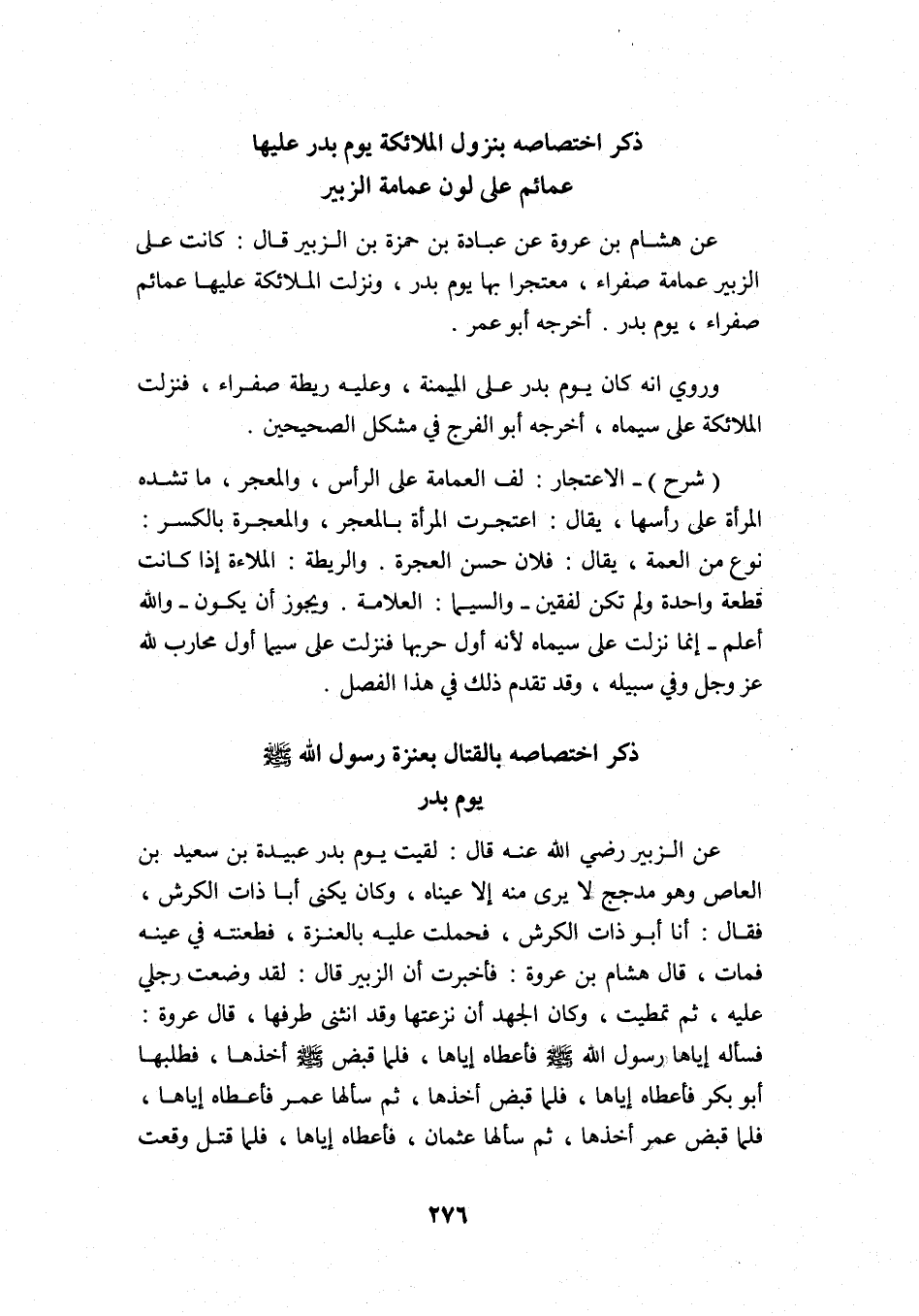 عن هشام بن عروة عن عبادة بن حمزة بن الزبير قال: كانت على الزبير عمامة صفراء، معتجرًا بها يوم بدر، ونزلت الملائكة عليها عمائم صفراء يوم بدر. أخرجه أبو عمر.