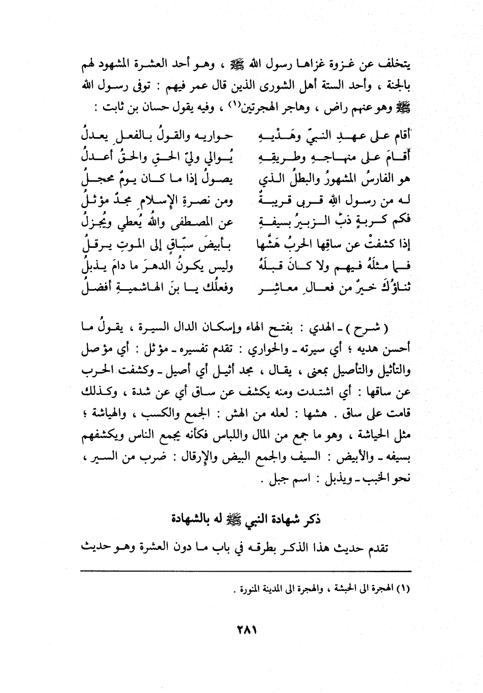 "شرح" الهدي بفتح الهاء وإسكان الدال: السيرة، يقول: ما أحسن هديه أي: سيرته, والحواري: تقدم تفسيره, مؤثل أي: مؤصل والتأثيل والتأصيل بمعنًى، يقال: مجد أثيل أي: أصيل, وكشفت الحرب عن ساقها أي: اشتدت, ومنه: {يُكْشَفُ عَنْ سَاقٍ} أي: عن شدة، وكذلك قامت على ساق, هشها لعله من الهش: الجمع والكسب، والهياشة مثل الحياشة، وهو ما جمع من المال واللباس فكأنه يجمع الناس ويكشفهم بسيفه, والأبيض: السيف والجمع: البيض, والإرقال: ضرب من السير نحو الخبب, ويذبل: اسم جبل.