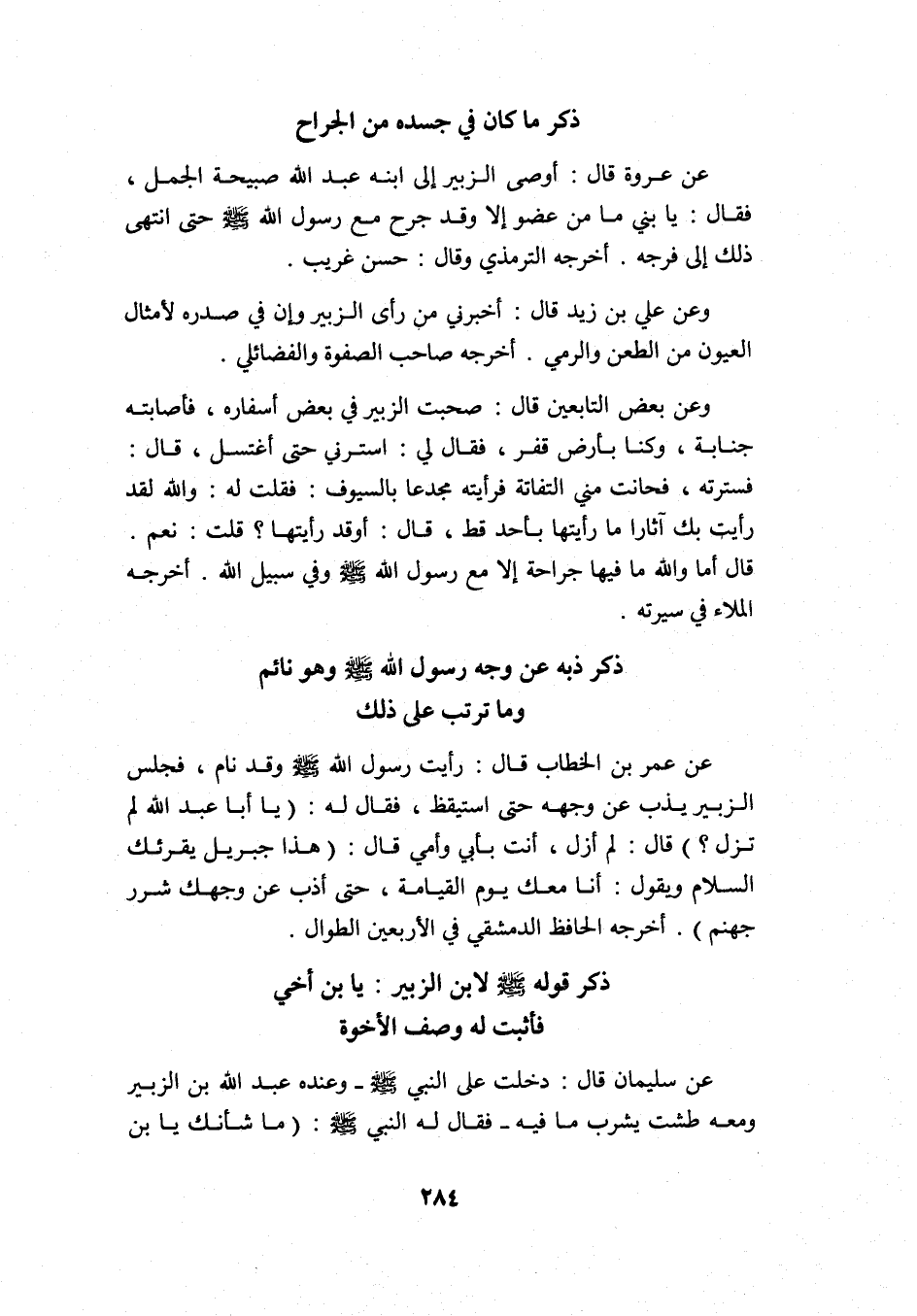 عن عروة قال: أوصى الزبير إلى ابنه عبد الله صبيحة الجمل، فقال: يا بني ما من عضو إلا وقد جرح مع رسول الله -صلى الله عليه وسلم- حتى انتهى ذلك إلى فرجه. أخرجه الترمذي وقال: حسن غريب.