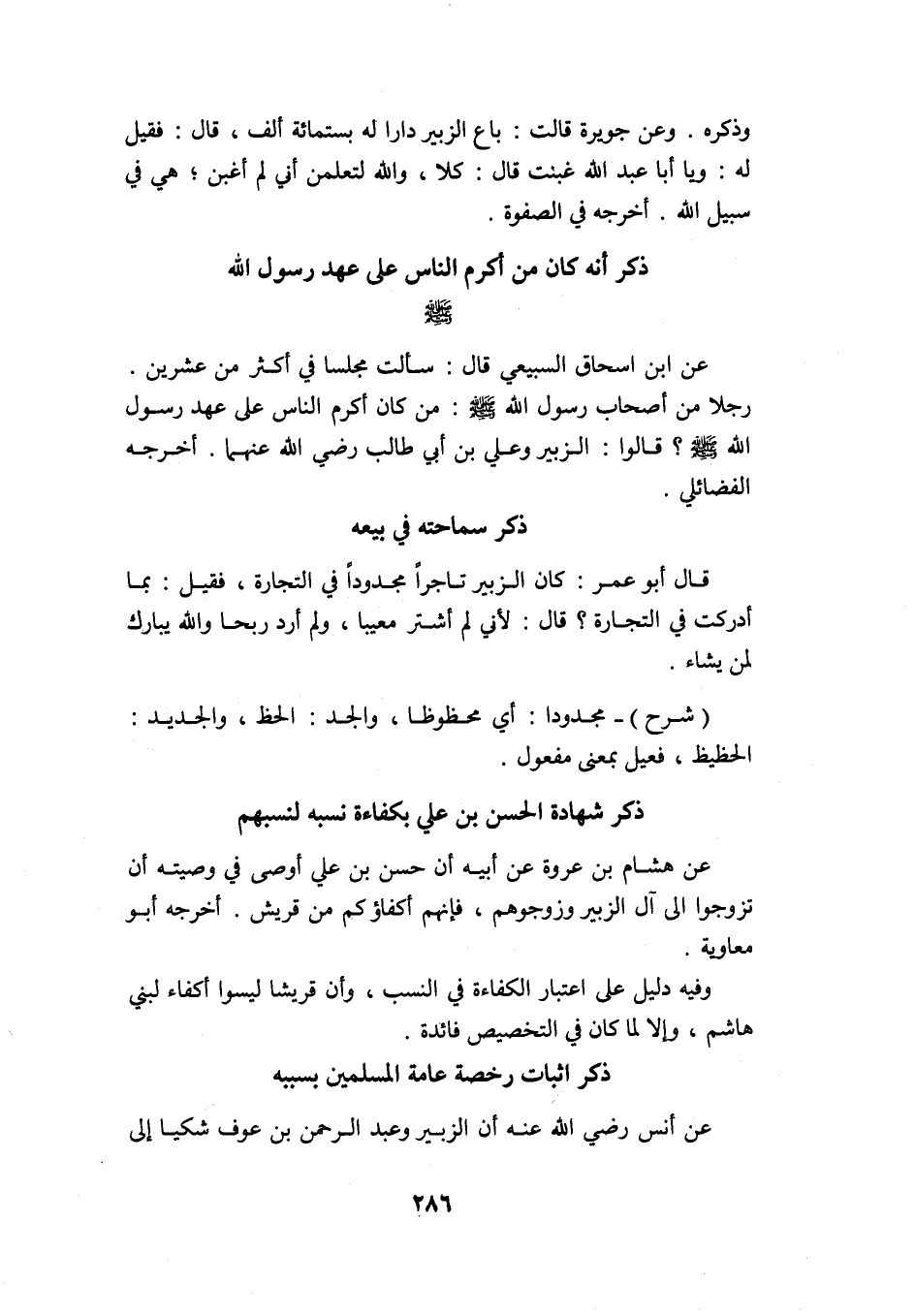 وذكره. وعن جويرية قالت: باع الزبير دارًا له بستمائة ألف، قال: فقيل له: يا أبا عبد الله غبنت قال: كلا، والله لتعلمن أني لم أغبن؛ هي في سبيل الله. أخرجه في الصفوة.