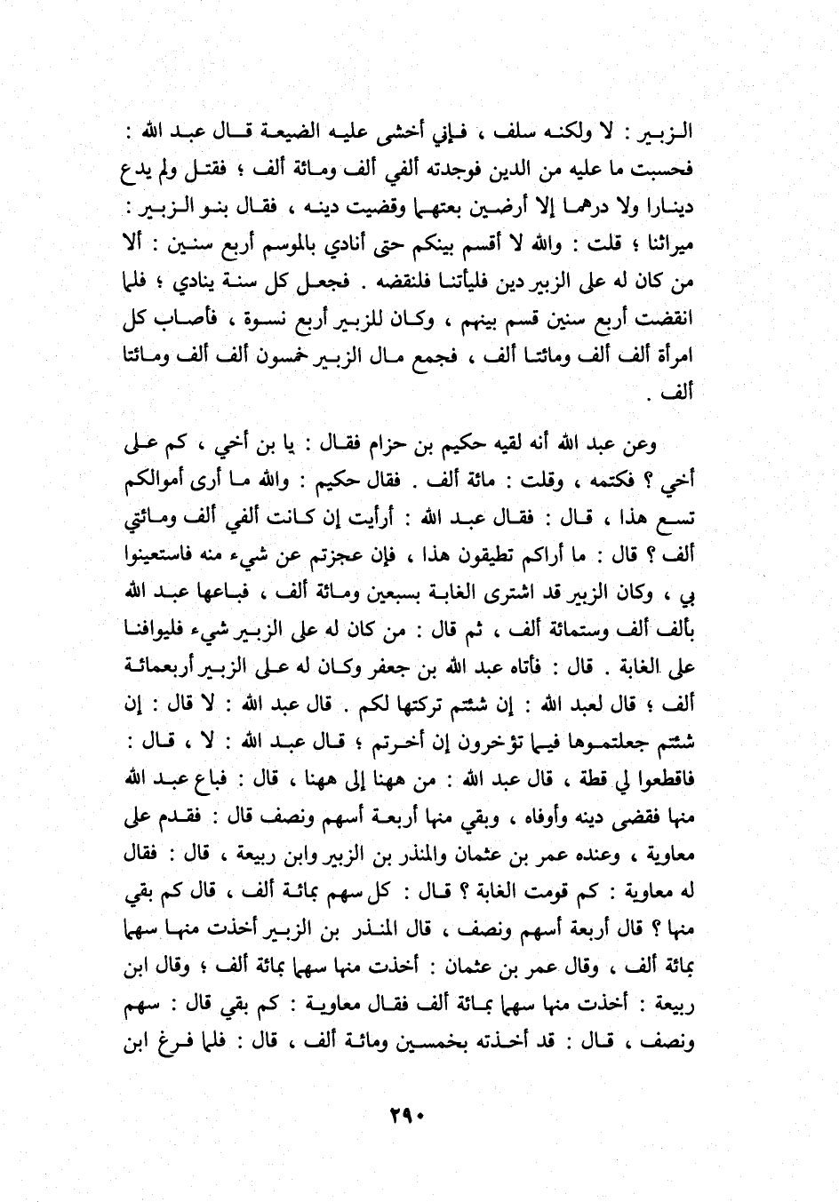 الزبير: لا ولكنه سلف، فإني أخشى عليه الضيعة قال عبد الله: فحسبت ما عليه من الدين فوجدته ألفي ألف ومائة ألف؛ فقتل ولم يدع دينارا ولا درهما إلا أرضين بعتهما وقضيت دينه، فقال بنو الزبير: ميراثنا؛ قلت: والله لا أقسم بينكم حتى أنادي بالموسم أربع سنين: ألا من كان له على الزبير دين فليأتنا فلنقضه. فجعل كل سنة ينادي؛ فلما انقضت أربع سنين قسم بينهم، وكان للزبير أربع نسوة، فأصاب كل امرأة ألف ألف ومائتا ألف، فجمع مال الزبير خمسون ألف ألف ومائتا ألف.