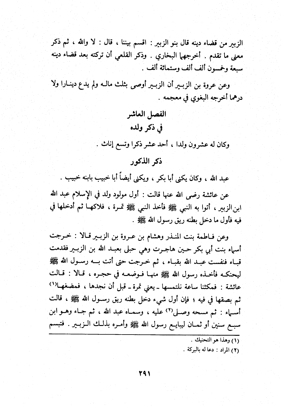 وعن فاطمة بنت المنذر وهشام بن عروة بن الزبير قالا: خرجت أسماء بنت أبي بكر حين هاجرت وهي حبلى بعبد الله بن الزبير فقدمت قباء فنفست عبد الله بقباء، ثم خرجت حتى أتت به رسول الله -صلى الله عليه وسلم- ليحنكه, فأخذه رسول الله -صلى الله عليه وسلم- منها فوضعه في حجره، قالا: قالت عائشة: فمكثنا ساعة نلتمسها -يعني تمرة- قبل أن نجدها، فمضغها1 ثم بصقها في فيه؛ فإن أول شيء دخل بطنه ريق رسول الله -صلى الله عليه وسلم- قالت أسماء: ثم مسحه وصلى2 عليه، وسماه عبد الله، ثم جاء وهو ابن سبع سنين أو ثمانٍ ليبايع رسول الله -صلى الله عليه وسلم- وأمره بذلك الزبير, فتبسم