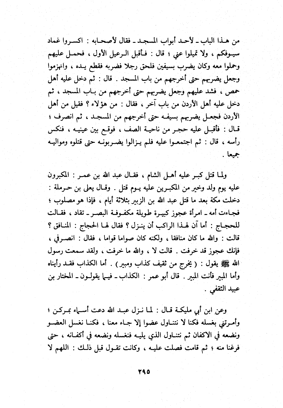 من هذا الباب -لأحد أبواب المسجد- فقال لأصحابه: اكسروا غماد سيوفكم ولا تميلوا عني؛ قال: فأقبل الرعيل الأول، فحمل عليهم وحملوا معه وكان يضرب بسيفين فلحق رجلا فضربه فقطع يده، وانهزموا وجعل يضربهم حتى أخرجهم من باب المسجد. قال: ثم دخل عليه أهل حمص، فشد عليهم وجعل يضربهم حتى أخرجهم من باب المسجد، ثم دخل عليه أهل الأردن من باب آخر، فقال: من هؤلاء? فقيل: من أهل الأردن فجعل يضربهم بسيفه حتى أخرجهم من المسجد، ثم انصرف؛ قال: فأقبل عليه حجر من ناحية الصف، فوقع بين عينيه، فنكس رأسه، قال: ثم اجتمعوا عليه فلم يزالوا يضربونه, حتى قتلوه ومواليه جميعا.