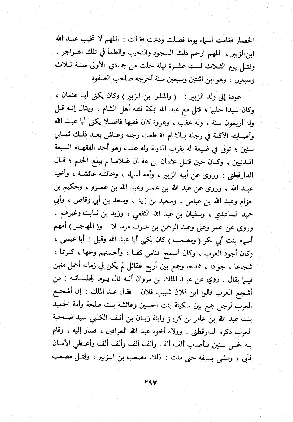 عودة إلى ولد الزبير: "والمنذر بن الزبير" وكان يكنى أبا عثمان، وكان سيدا حليما؛ قتل مع عبد الله بمكة قتله أهل الشام، ويقال: إنه قتل وله أربعون سنة، وله عقب، وعروة كان فقيها فاضلا يكنى أبا عبد الله وأصابته الأكلة في رجله بالشام فقطعت رجله وعاش بعد ذلك ثماني سنين؛ توفي في ضيعة له بقرب المدينة وله عقب, وهو أحد الفقهاء السبعة المدنيين، وكان حين قتل عثمان بن عفان غلاما لم يبلغ الحلم؛ قال الدارقطني: وروى عن أبيه الزبير، وأمه أسماء، وخالته عائشة، وأخيه عبد الله، وروى عن عبد الله بن عمر وعبد الله بن عمرو، وحكيم بن حزام وعبد الله بن عباس، وسعيد بن زيد، وسعد بن أبي وقاص، وأبي حميد الساعدي، وسفيان بن عبد الله الثقفي، وزيد بن ثابت, وغيرهم, وروى عن عمر وعلي وعبد الرحمن بن عوف مرسلا. و"المهاجر" أمهم أسماء بنت أبي بكر و"مصعب" كان يكنى أبا عبد الله وقيل: أبا عيسى، وكان أجود العرب، وكان أسمح الناس كفا، وأحسنهم وجها، كريما، شجاعا، جوادا، ممدحا وجمع بين أربع عقائل لم يكن في زمانه أجمل منهن فيما يقال. روي عن عبد الملك بن مروان أنه قال يوما لجلسائه: من أشجع العرب؟ قالوا: ابن فلان شبيب فلان. فقال عبد الملك: إن أشجع العرب لرجل جمع بين سكينة بنت الحسين وعائشة بنت طلحة وأمة الحميد بنت عبد الله بن عامر بن كريز وابنة زيان بن أنيف الكلبي سيد ضاحية العرب, ذكره الدارقطني. وولاه أخوه عبد الله العراقين، فسار إليه، وقام به خمس سنين فأصاب ألف ألف وألف ألف وألف ألف وأعطي الأمان فأبى، ومشى بسيفه حتى مات. ذلك مصعب بن الزبير، وقتل مصعب