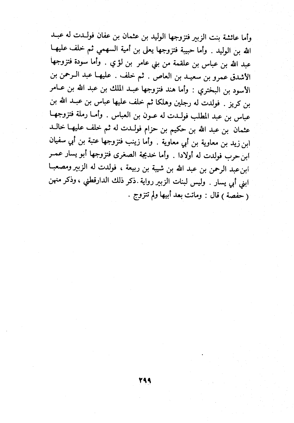 وأما عائشة بنت الزبير فتزوجها الوليد بن عثمان بن عفان فولدت له عبد الله بن الوليد. وأما حبيبة فتزوجها يعلى بن أمية السهمي, ثم خلف عليها عبد الله بن عباس بن علقمة من بني عامر بن لؤي. وأما سودة فتزوجها الأشدق عمرو بن سعيد بن العاص, ثم خلف عليها عبد الرحمن بن الأسود بن البختري. وأما هند فتزوجها عبد الملك بن عبد الله بن عامر بن كريز فولدت له رجلين وهلكا, ثم خلف عليها عباس بن عبد الله بن عباس بن عبد المطلب فولدت له عون بن العباس. وأما رملة فتزوجها عثمان بن عبد الله بن حكيم بن حزام فولدت له, ثم خلف عليها خالد بن زيد بن معاوية بن أبي معاوية. وأما زينب فتزوجها عتبة بن أبي سفيان بن حرب فولدت له أولادا. وأما خديجة الصغرى فتزوجها أبو يسار عمر بن عبد الرحمن بن عبد الله بن شيبة بن ربيعة، فولدت له الزبير ومصعبا ابني أبي يسار, وليس لبنات الزبير رواية. ذكر ذلك الدارقطني، وذكر منهن "حفصة" قال: وماتت بعد أبيها ولم تتزوج.
