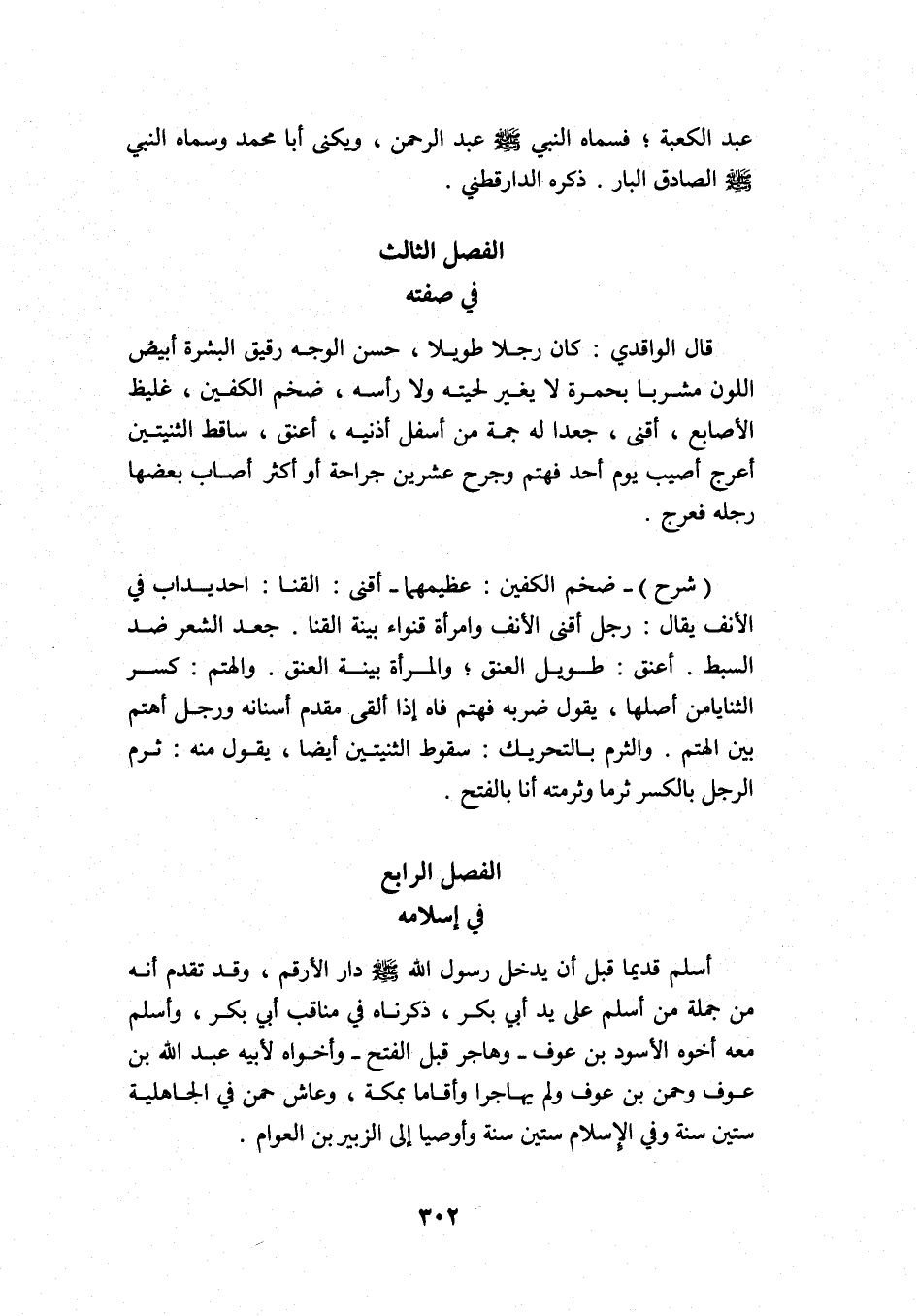 "شرح" ضخم الكفين: عظيمهما, أقنى: القنا: احديداب في الأنف يقال: رجل أقنى الأنف وامرأة قنواء بينة القنا, جعد الشعر ضد السبط, أعنق: طويل العنق؛ والمرأة بينة العنق, والهتم: كسر الثنايا من أصلها، يقول: ضربه فهتم فاه إذا ألقى مقدم أسنانه, ورجل أهتم بين الهتم, والثرم بالتحريك: سقوط الثنيتين أيضا، يقول منه: ثرم الرجل بالكسر ثرما وثرمته أنا بالفتح.