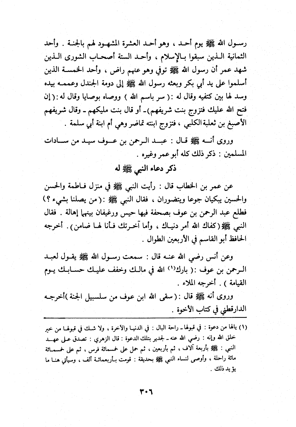 1 يا لها من دعوة في قبولها راحة البال في الدنيا والآخرة، ولا شك في قبولها من خير خلق الله, وإنه -رضي الله عنه- لجدير بتلك الدعوة. قال الزهري: تصدق على عهد النبي -صلى الله عليه وسلم- بأربعة آلاف، ثم بأربعين، ثم حمل على خمسمائة فرس، ثم على خمسمائة مائة راحلة، وأوصى لنساء النبي -صلى الله عليه وسلم- بحديقة قومت بأربعمائة ألف، وسيأتي هنا ما يؤيد ذلك.