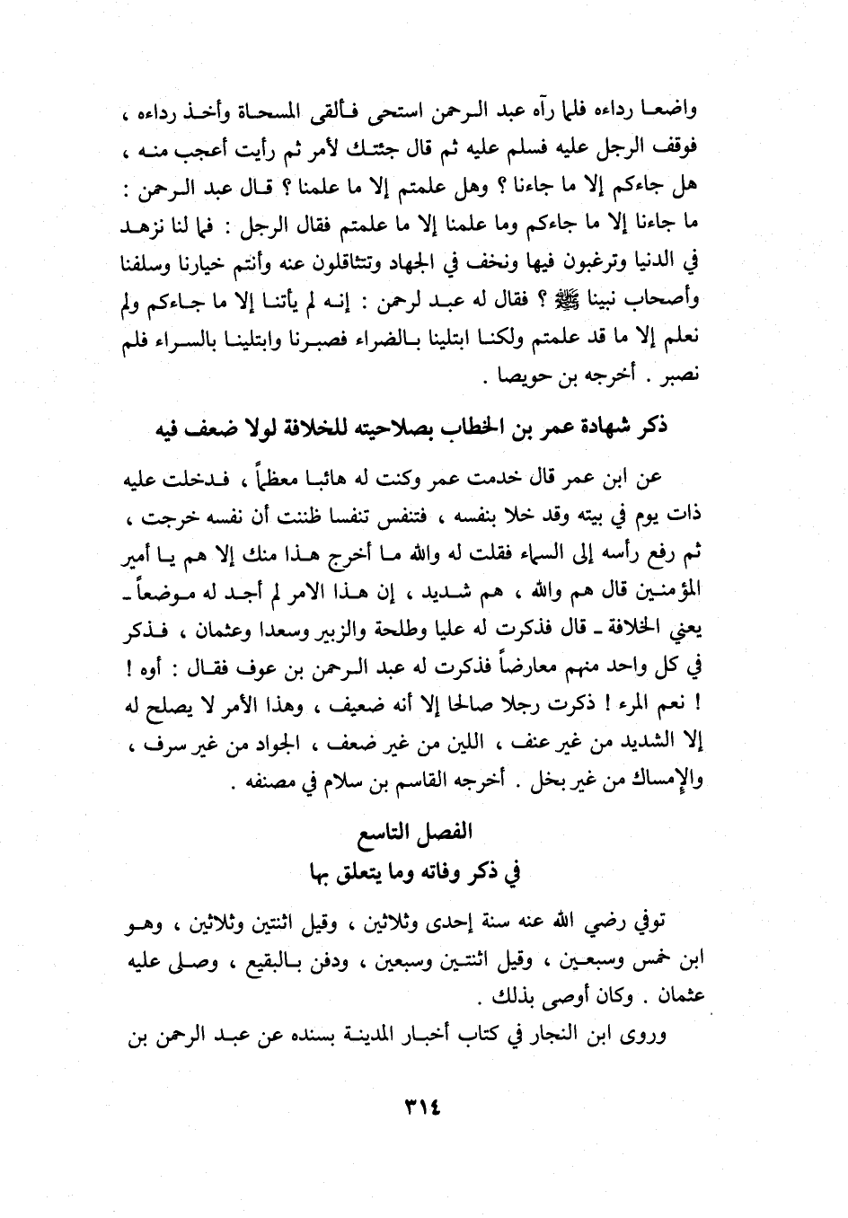 عن ابن عمر قال: خدمت عمر وكنت له هائبًا معظمًا، فدخلت عليه ذات يوم في بيته وقد خلا بنفسه، فتنفس تنفسا ظننت أن نفسه خرجت، ثم رفع رأسه إلى السماء فقلت له: والله ما أخرج هذا منك إلا هم يا أمير المؤمنين قال: هم والله، هم شديد، إن هذا الأمر لم أجد له موضعًا -يعني الخلافة- قال: فذكرت له عليا وطلحة والزبير وسعدا وعثمان فذكر في كل واحد منهم معارضًا, فذكرت له عبد الرحمن بن عوف فقال: أوه! نعم المرء! ذكرت رجلا صالحا إلا أنه ضعيف، وهذا الأمر لا يصلح له إلا الشديد من غير عنف، اللين من غير ضعف، الجواد من غير سرف، الممسك من غير بخل. أخرجه القاسم بن سلام في مصنفه.