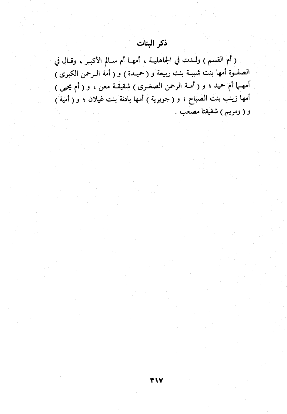 "أم القسم" ولدت في الجاهلية، أمها أم سالم الأكبر، وقال في الصفوة: أمها بنت شيبة بنت ربيعة و"حميدة" و"أمة الرحمن الكبرى" أمهما أم حميد؛ و"أمة الرحمن الصغرى" شقيقة معن، و"أم يحيى" أمها زينب بنت الصباح؛ و"جويرية" أمها بادنة بنت غيلان؛ و"أمية" و"مريم" شقيقتا مصعب.