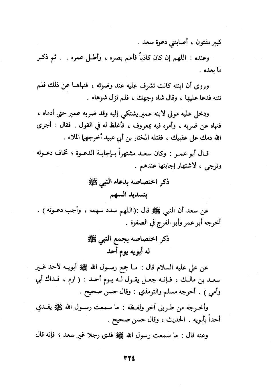 عن علي عليه السلام قال: ما جمع رسول الله -صلى الله عليه وسلم- أبويه لأحد غير سعد بن مالك، فإنه جعل يقول له يوم أحد: "ارم، فداك أبي وأمي" أخرجه مسلم والترمذي, وقال: حسن صحيح.