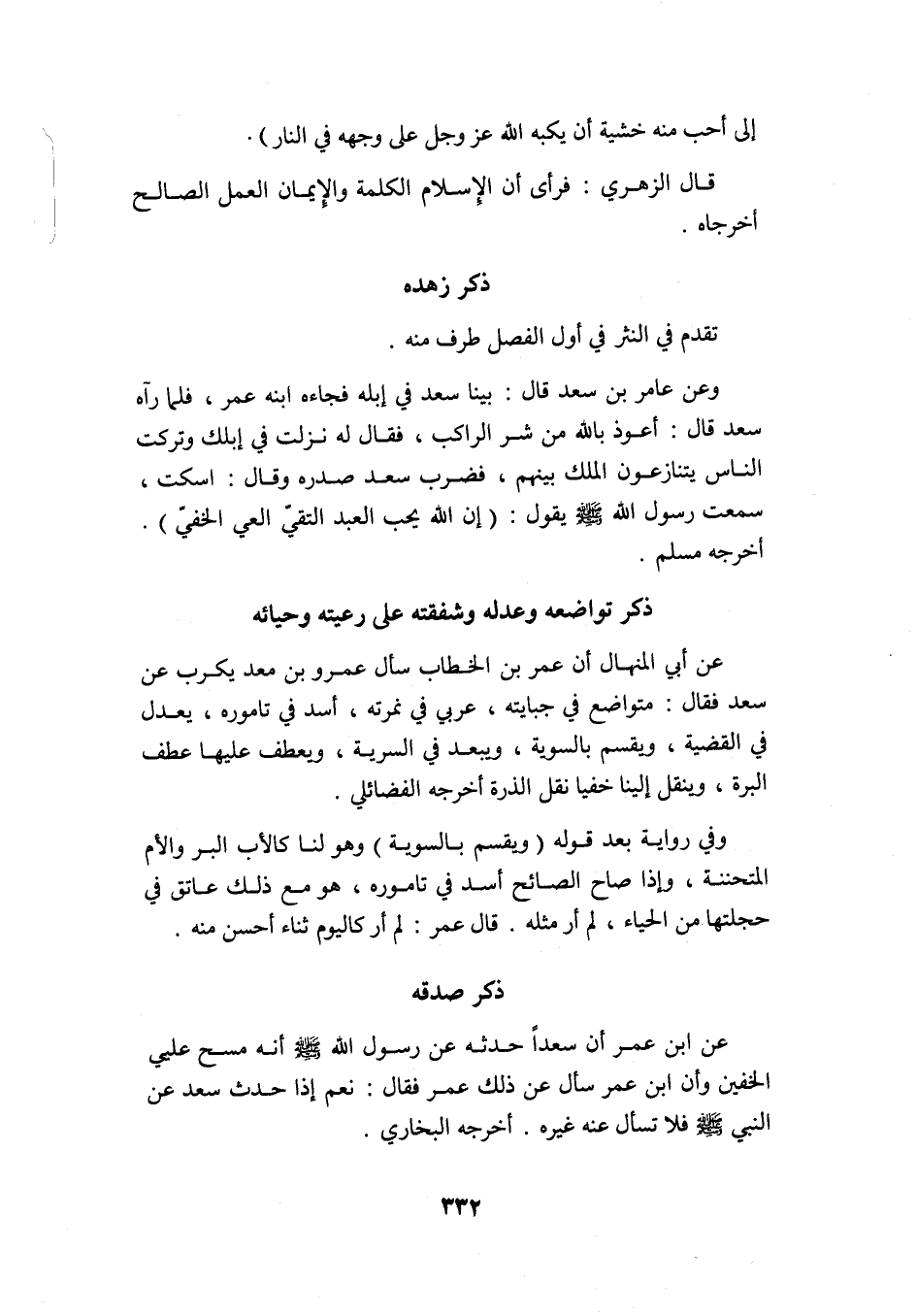 عن ابن عمر أن سعدًا حدثه عن رسول الله -صلى الله عليه وسلم- أنه مسح على الخفين, وإن ابن عمر سأل عن ذلك عمر فقال: نعم, إذا حدث سعد عن النبي -صلى الله عليه وسلم- فلا تسأل عنه غيره. أخرجه البخاري.