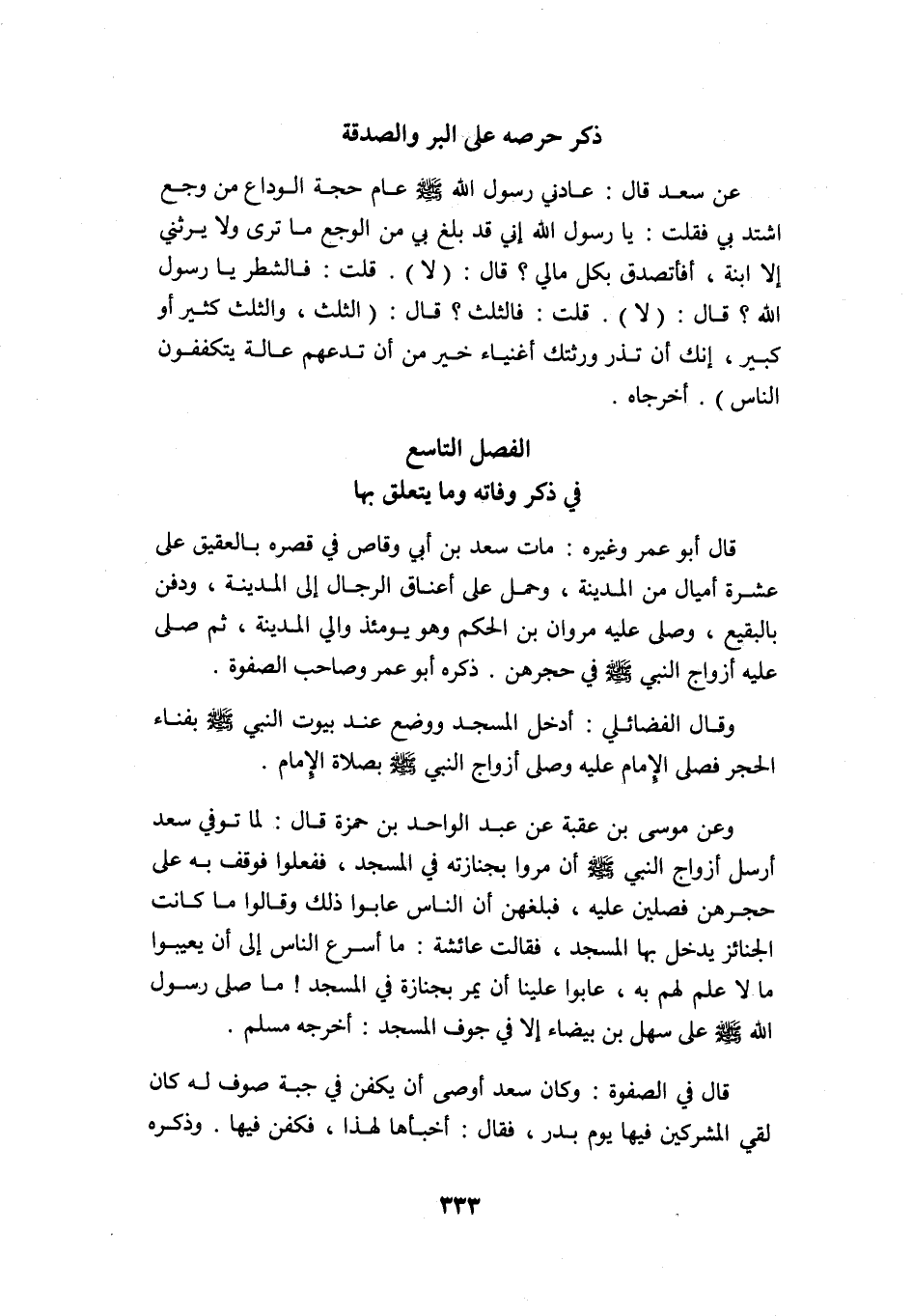 عن سعد قال: عادني رسول الله -صلى الله عليه وسلم- عام حجة الوداع من وجع اشتد بي فقلت: يا رسول الله إني قد بلغ بي من الوجع ما ترى ولا يرثني إلا ابنة، أفأتصدق بكل مالي? قال: "لا" قلت: فالشطر يا رسول الله? قال: "لا" قلت: فالثلث? قال: "الثلث، والثلث كثير أو كبير، إنك إن تذر ورثتك أغنياء خير من أن تدعهم عالة يتكففون الناس" أخرجاه.