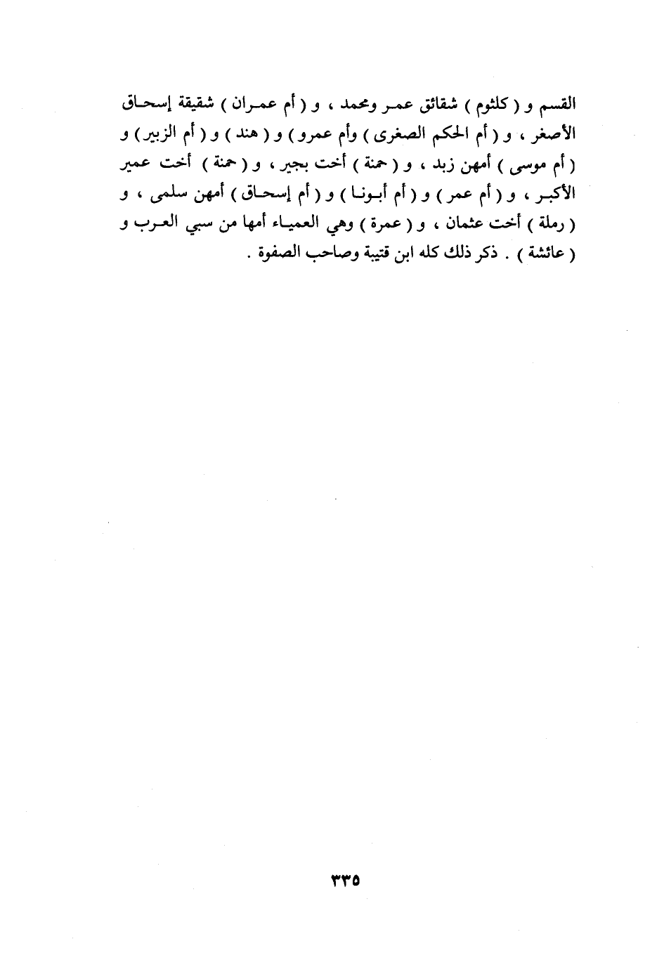 "أم الحكم الكبرى" شقيقة إسحاق الأكبر، و"حفصة" و"أم القسم" و"كلثوم" شقائق عمر ومحمد، و"أم عمران" شقيقة إسحاق الأصغر، و"أم الحكم الصغرى" و"أم عمرو" و"هند" و"أم الزبير" و"أم موسى" أمهن زبد، و"حمنة" أخت بجير، و"حمنة" أخت عمير الأكبر، و"أم عمر" و"أم أبونا" و"أم إسحاق" أمهن سلمى، و"رملة" أخت عثمان، و"عمرة" وهي العمياء أمها من سبي العرب و"عائشة" ذكر ذلك كله ابن قتيبة وصاحب الصفوة.