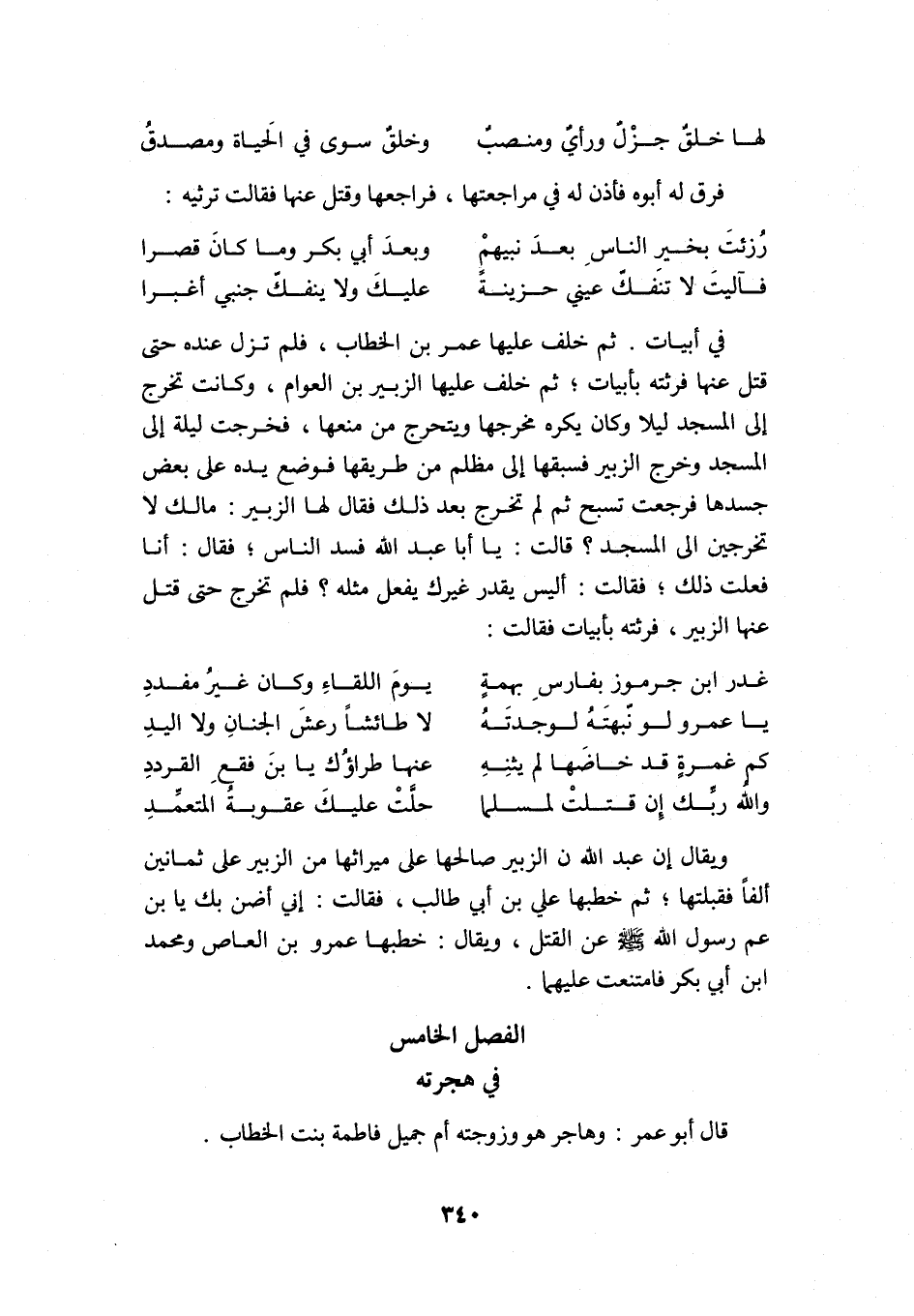 في أبيات. ثم خلف عليها عمر بن الخطاب، فلم تزل عنده حتى قتل عنها فرثته بأبيات؛ ثم خلف عليها الزبير بن العوام، وكانت تخرج إلى المسجد ليلا وكان يكره مخرجها ويتحرج من منعها، فخرجت ليلة إلى المسجد وخرج الزبير فسبقها إلى مظلم من طريقها فوضع يده على بعض جسدها فرجعت تسبح, ثم لم تخرج بعد ذلك فقال لها الزبير: ما لك لا تخرجين إلى المسجد? قالت: يا أبا عبد الله فسد الناس؛ فقال: أنا فعلت ذلك؛ فقالت: أليس يقدر غيرك يفعل مثله? فلم تخرج حتى قتل عنها الزبير، فرثته بأبيات فقالت:
