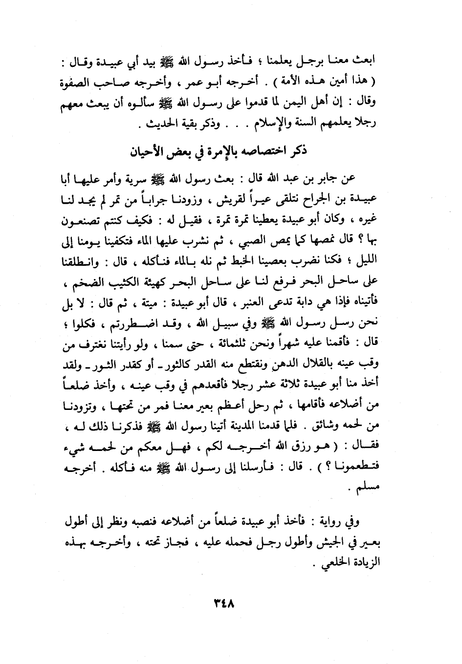 عن جابر بن عبد الله قال: بعث رسول الله -صلى الله عليه وسلم- سرية وأمر عليها أبا عبيدة بن الجراح نتلقى عيرًا لقريش، وزودنا جرابا من تمر لم يجد لنا غيره، وكان أبو عبيدة يعطينا تمرة تمرة، فقيل له: فكيف كنتم تصنعون بها؟ قال: نمصها كما يمص الصبي، ثم نشرب عليها الماء فتكفينا يومنا إلى الليل، فكنا نضرب بعصينا الخبط ثم نله بالماء فنأكله، قال: وانطلقنا على ساحل البحر فرفع لنا على ساحل البحر كهيئة الكثيب الضخم، فأتيناه فإذا هي دابة تدعى العنبر، قال أبو عبيدة: ميتة، ثم قال: لا بل نحن رسل رسول الله -صلى الله عليه وسلم- وفي سبيل الله، وقد اضطررتم، فكلوا؛ قال: فأقمنا عليه شهرًا ونحن ثلاثمائة حتى سمنا، ولو رأيتنا نغترف من وقب عينه بالقلال الدهن ونقتطع منه القدر كالثور -أو كقدر الثور- ولقد أخذ منا أبو عبيدة ثلاثة عشر رجلا فأقعدهم في وقب عينه، وأخذ ضلعا من أضلاعه فأقامها، ثم رحل أعظم بعير معنا فمر من تحتها، وتزودنا من لحمه وشائق. فلما قدمنا المدينة أتينا رسول الله -صلى الله عليه وسلم- فذكرنا ذلك له، فقال: "هو رزق الله أخرجه لكم، فهل معكم من لحمه شيء فتطعموننا?" قال: فأرسلنا إلى رسول الله -صلى الله عليه وسلم- منه فأكله. أخرجه مسلم.