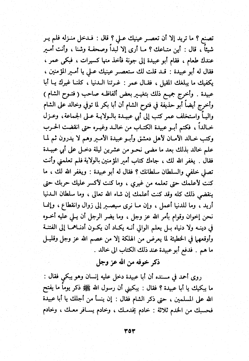 تصنع? ما تريد إلا أن تعصر عينيك علي? قال: فدخل منزله فلم ير شيئًا، قال: أين متاعك? ما أرى إلا لبدًا وصحفة وشنا، وأنت أمير عندك طعام، فقام أبو عبيدة إلى جونة فأخذ منها كسيرات، فبكى عمر، فقال أبو عبيدة: قد قلت لك: ستعصر عينيك علي يا أمير المؤمنين، يكفيك ما يبلغك المقيل، فقال عمر: غرتنا الدنيا، كلنا غيرك يا أبا عبيدة. وأخرج جميع ذلك بتغيير بعض ألفاظه صاحب "فتوح الشام" وأخرج أيضًا أبو حذيفة في فتوح الشام أن أبا بكر لما توفي وخالد على الشام واليًا واستخلف عمر, كتب إلى أبي عبيدة بالولاية على الجماعة وعزل خالدًا، فكتم أبو عبيدة الكتاب من خالد وغيره حتى انقضت الحرب وكتب خالد الأمان لأهل دمشق وأبو عبيدة الأمير وهم لا يدرون, ثم لما علم خالد بذلك بعدما مضى نحو من عشرين ليلة دخل على أبي عبيدة فقال: يغفر الله لك، جاءك كتاب أمير المؤمنين بالولاية فلم تعلمني وأنت تصلي خلفي والسلطان سلطانك? فقال له أبو عبيدة: ويغفر الله لك، ما كنت لأعلمك حتى تعلمه من غيري, وما كنت لأكسر عليك حربك حتى ينقضي ذلك كله وقد كنت أعلمك إن شاء الله تعالى، وما سلطان الدنيا أريد، وما للدنيا أعمل، وإن ما نرى سيصير إلى زوال وانقطاع، وإنما نحن إخوان وقوام بأمر الله -عز وجل- وما يضر الرجل أن يلي عليه أخوه في دينه ولا دنياه بل يعلم الوالي أنه يكاد أن يكون أدناهما إلى الفتنة وأوقعهما في الخطيئة لما يعرض من الهلكة إلا من عصم الله -عز وجل- وقليل ما هم, فدفع أبو عبيدة عند ذلك الكتاب إلى خالد.