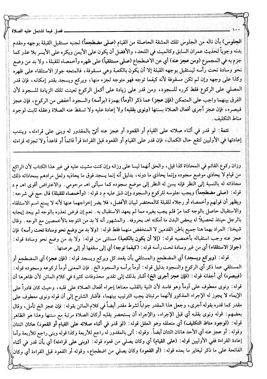 الْجُلُوسِ) بِأَنْ نَالَهُ مِنْ الْجُلُوسِ تِلْكَ الْمَشَقَّةُ الْحَاصِلَةُ مِنْ الْقِيَامِ (صَلَّى مُضْطَجِعًا) لِجَنْبِهِ مُسْتَقْبِلَ الْقِبْلَةِ بِوَجْهِهِ وَمُقَدَّمِ بَدَنِهِ وُجُوبًا لِحَدِيثِ عِمْرَانَ السَّابِقِ وَكَالْمَيِّتِ فِي اللَّحْدِ، وَالْأَفْضَلُ أَنْ يَكُونَ عَلَى الْأَيْمَنِ وَيُكْرَهُ عَلَى الْأَيْسَرِ بِلَا عُذْرٍ كَمَا جَزَمَ بِهِ فِي الْمَجْمُوعِ (وَمَنْ عَجَزَ عَنْهُ) أَيْ عَنْ الِاضْطِجَاعِ (صَلَّى مُسْتَلْقِيًا) عَلَى ظَهْرِهِ وَأَخْمَصَاهُ لِلْقِبْلَةِ، وَلَا بُدَّ مِنْ وَضْعِ نَحْوِ وِسَادَةٍ تَحْتَ رَأْسِهِ لِيَسْتَقْبِلَ بِوَجْهِهِ الْقِبْلَةَ إلَّا أَنْ يَكُونَ بِالْكَعْبَةِ وَهِيَ مَسْقُوفَةٌ، فَالْمُتَّجَهُ جَوَازُ الِاسْتِلْقَاءِ عَلَى ظَهْرِهِ وَكَذَا عَلَى وَجْهِهِ وَإِنْ لَمْ تَكُنْ مَسْقُوفَةً لِأَنَّهُ كَيْفَمَا تَوَجَّهَ فَهُوَ مُتَوَجِّهٌ لِجُزْءٍ مِنْهَا، وَيَرْكَعُ وَيَسْجُدُ بِقَدْرِ إمْكَانِهِ، فَإِنْ قَدَرَ الْمُصَلِّي عَلَى الرُّكُوعِ فَقَطْ كَرَّرَهُ لِلسُّجُودِ، وَمَنْ قَدَرَ عَلَى زِيَادَةٍ عَلَى أَكْمَلِ الرُّكُوعِ تَعَيَّنَتْ تِلْكَ الزِّيَادَةُ لِلسُّجُودِ لِأَنَّ الْفَرْقَ بَيْنَهُمَا وَاجِبٌ عَلَى الْمُتَمَكِّنِ (فَإِنْ عَجَزَ) عَمَّا ذُكِرَ (أَوْمَأَ) بِهَمْزَةٍ (بِرَأْسِهِ) وَالسُّجُودُ أَخْفَضُ مِنْ الرُّكُوعِ، فَإِنْ عَجَزَ فَبِبَصَرِهِ، فَإِنْ عَجَزَ أَجْرَى أَفْعَالَ الصَّلَاةِ بِسُنَنِهَا (وَنَوَى بِقَلْبِهِ) وَلَا إعَادَةَ عَلَيْهِ وَلَا تَسْقُطُ عَنْهُ الصَّلَاةُ وَعَقْلُهُ ثَابِتٌ لِوُجُودِ مَنَاطِ التَّكْلِيفِ. تَتِمَّةٌ: لَوْ قَدَرَ فِي أَثْنَاءِ صَلَاتِهِ عَلَى الْقِيَامِ أَوْ الْقُعُودِ أَوْ عَجَزَ عَنْهُ أَتَى بِالْمَقْدُورِ لَهُ وَبَنَى عَلَى قِرَاءَتِهِ، وَيُنْدَبُ إعَادَتُهَا فِي الْأَوَّلِيَّيْنِ لِتَقَعَ حَالَ الْكَمَالِ، فَإِنْ قَدَرَ عَلَى الْقِيَامِ أَوْ الْقُعُودِ قَبْلَ الْقِرَاءَةِ قَرَأَ قَائِمًا أَوْ قَاعِدًا وَلَا تُجْزِئُهُ قِرَاءَتُهُ