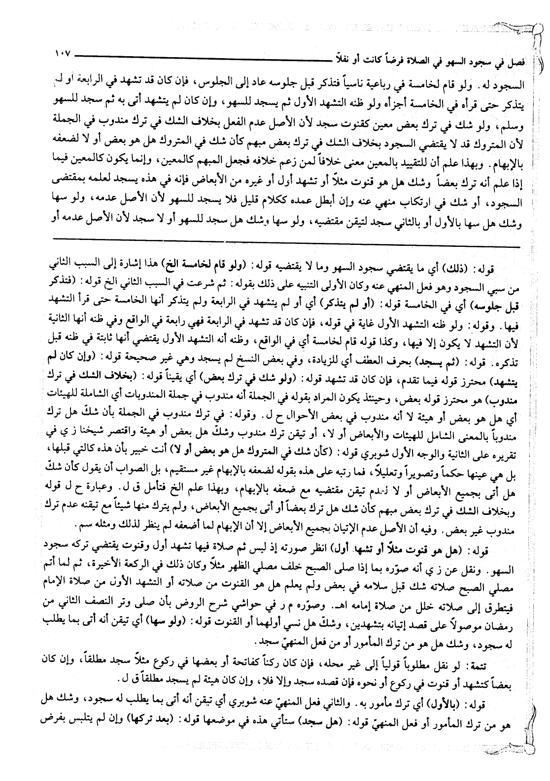 السُّجُودِ لَهُ. وَلَوْ قَامَ لِخَامِسَةٍ فِي رُبَاعِيَّةٍ نَاسِيًا فَتَذَكَّرَ قَبْلَ جُلُوسِهِ عَادَ إلَى الْجُلُوسِ، فَإِنْ كَانَ قَدْ تَشَهَّدَ فِي الرَّابِعَةِ أَوْ لَمْ يَتَذَكَّرْ حَتَّى قَرَأَهُ فِي الْخَامِسَةِ أَجْزَأَهُ وَلَوْ ظَنَّهُ التَّشَهُّدَ الْأَوَّلَ ثُمَّ يَسْجُدُ لِلسَّهْوِ، وَإِنْ كَانَ لَمْ يَتَشَهَّدْ أَتَى بِهِ ثُمَّ سَجَدَ لِلسَّهْوِ وَسَلَّمَ، وَلَوْ شَكَّ فِي تَرْكِ بَعْضِ مُعَيَّنٍ كَقُنُوتٍ سَجَدَ لِأَنَّ الْأَصْلَ عَدَمُ الْفِعْلِ بِخِلَافِ الشَّكِّ فِي تَرْكِ مَنْدُوبٍ فِي الْجُمْلَةِ لِأَنَّ الْمَتْرُوكَ قَدْ لَا يَقْتَضِي السُّجُودَ بِخِلَافِ الشَّكِّ فِي تَرْكِ بَعْضٍ مُبْهَمٍ كَأَنْ شَكَّ فِي الْمَتْرُوكِ هَلْ هُوَ بَعْضٌ أَوْ لَا لِضَعْفِهِ بِالْإِبْهَامِ. وَبِهَذَا عُلِمَ أَنَّ لِلتَّقْيِيدِ بِالْمُعَيَّنِ مَعْنًى خِلَافًا لِمَنْ زَعَمَ خِلَافَهُ فَجَعَلَ الْمُبْهَمَ كَالْمُعَيَّنِ، وَإِنَّمَا يَكُونُ كَالْمُعَيَّنِ فِيمَا إذَا عَلِمَ أَنَّهُ تَرَكَ بَعْضًا وَشَكَّ هَلْ هُوَ قُنُوتٌ مَثَلًا أَوْ تَشَهُّدٌ أَوَّلُ أَوْ غَيْرُهُ مِنْ الْأَبْعَاضِ فَإِنَّهُ فِي هَذِهِ يَسْجُدُ لِعِلْمِهِ بِمُقْتَضَى السُّجُودِ، أَوْ شَكَّ فِي ارْتِكَابِ مَنْهِيٍّ عَنْهُ وَإِنْ أَبْطَلَ عَمْدُهُ كَكَلَامٍ قَلِيلٍ فَلَا يَسْجُدُ لِلسَّهْوِ لِأَنَّ الْأَصْلَ عَدَمُهُ، وَلَوْ سَهَا وَشَكَّ هَلْ سَهَا بِالْأَوَّلِ أَوْ بِالثَّانِي سَجَدَ لِتَيَقُّنِ مُقْتَضِيهِ، وَلَوْ سَهَا وَشَكَّ هَلْ سَجَدَ لِلسَّهْوِ أَوْ لَا سَجَدَ لِأَنَّ الْأَصْلَ عَدَمُهُ أَوْ