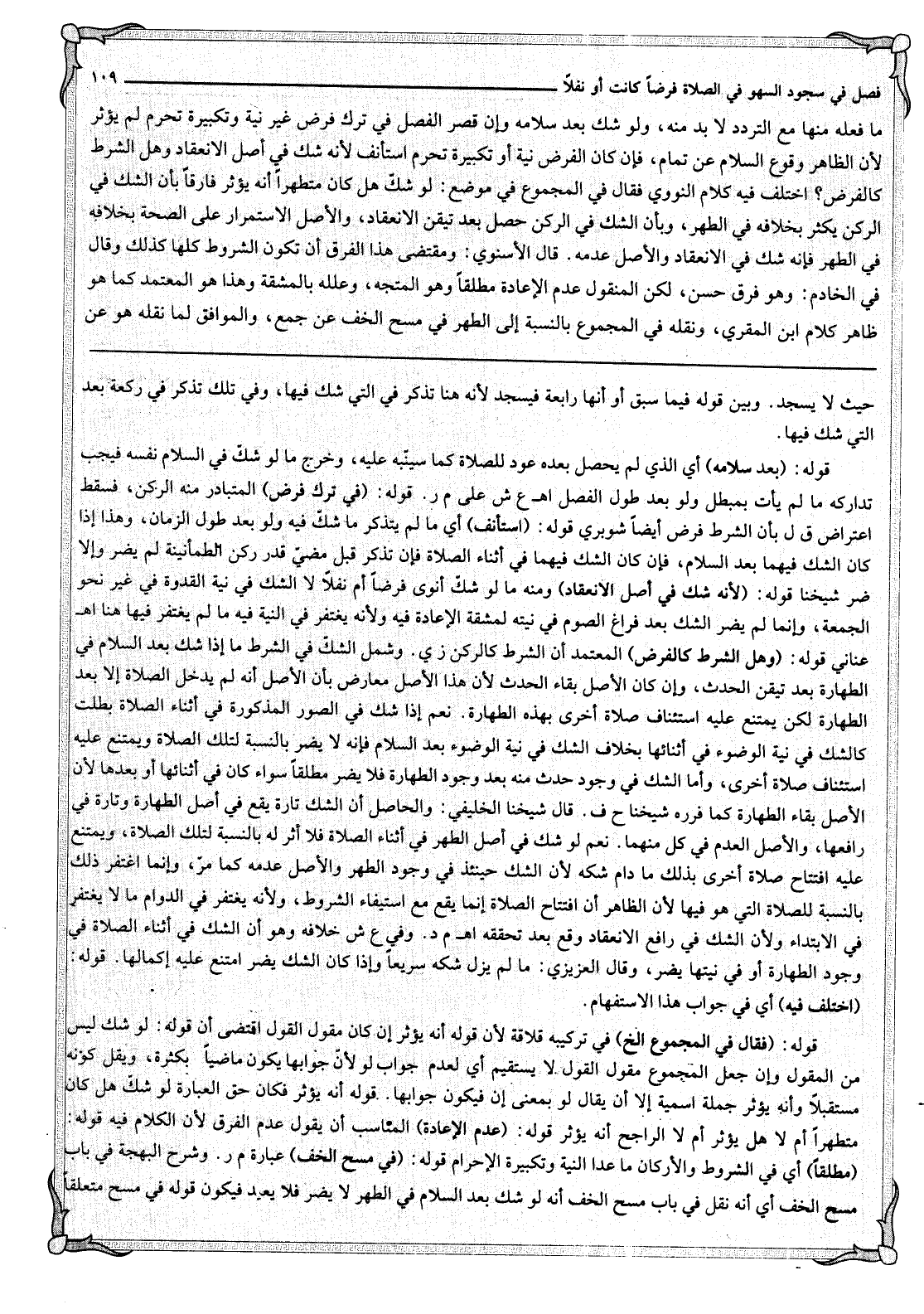 قَالَ شَيْخُنَا الْخَلِيفِيُّ: وَالْحَاصِلُ أَنَّ الشَّكَّ تَارَةً يَقَعُ فِي أَصْلِ الطَّهَارَةِ وَتَارَةً فِي رَافِعِهَا، وَالْأَصْلُ الْعَدَمُ فِي كُلٍّ مِنْهُمَا. نَعَمْ لَوْ شَكَّ فِي أَصْلِ الطُّهْرِ فِي أَثْنَاءِ الصَّلَاةِ فَلَا أَثَرَ لَهُ بِالنِّسْبَةِ لِتِلْكَ الصَّلَاةِ، وَيُمْتَنَعُ عَلَيْهِ افْتِتَاحُ صَلَاةٍ أُخْرَى بِذَلِكَ مَا دَامَ شَكُّهُ لِأَنَّ الشَّكَّ حِينَئِذٍ فِي وُجُودِ الطُّهْرِ وَالْأَصْلُ عَدَمُهُ كَمَا مَرَّ، وَإِنَّمَا اُغْتُفِرَ ذَلِكَ بِالنِّسْبَةِ لِلصَّلَاةِ الَّتِي هُوَ فِيهَا لِأَنَّ الظَّاهِرَ أَنَّ افْتِتَاحَ الصَّلَاةِ إنَّمَا يَقَعُ مَعَ اسْتِيفَاءِ الشُّرُوطِ، وَلِأَنَّهُ يُغْتَفَرُ فِي الدَّوَامِ مَا لَا يُغْتَفَرُ فِي الِابْتِدَاءِ وَلِأَنَّ الشَّكَّ فِي رَافِعِ الِانْعِقَادِ وَقَعَ بَعْدَ تَحَقُّقِهِ. اهـ. م د. وَفِي ع ش خِلَافُهُ وَهُوَ أَنَّ الشَّكَّ فِي أَثْنَاءِ الصَّلَاةِ فِي وُجُودِ الطَّهَارَةِ أَوْ فِي نِيَّتِهَا يَضُرُّ، وَقَالَ الْعَزِيزِيُّ: مَا لَمْ يَزُلْ شَكُّهُ سَرِيعًا وَإِذَا كَانَ الشَّكُّ يَضُرُّ امْتَنَعَ عَلَيْهِ إكْمَالُهَا.