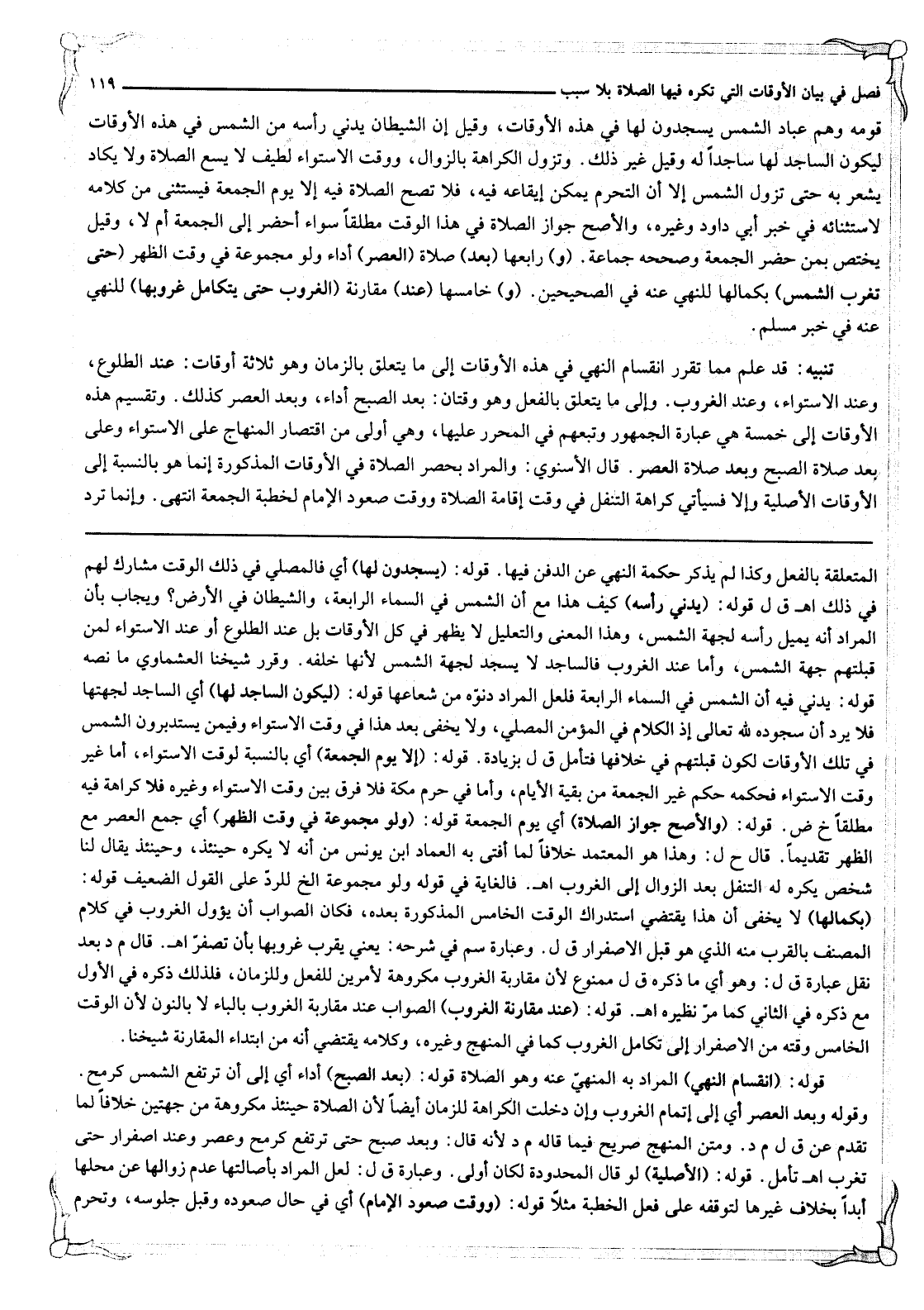 وَقَوْلُهُ وَبَعْدَ الْعَصْرِ أَيْ إلَى تَمَامِ الْغُرُوبِ وَإِنْ دَخَلَتْ الْكَرَاهَةُ لِلزَّمَانِ أَيْضًا لِأَنَّ الصَّلَاةَ حِينَئِذٍ مَكْرُوهَةٌ مِنْ جِهَتَيْنِ خِلَافًا لِمَا تَقَدَّمَ عَنْ ق ل م د. وَمَتْنُ الْمَنْهَجِ صَرِيحٌ فِيمَا قَالَهُ م د لِأَنَّهُ قَالَ: وَبَعْدَ صُبْحٍ حَتَّى تَرْتَفِعَ كَرُمْحٍ وَعَصْرٌ وَعِنْدَ اصْفِرَارٍ حَتَّى تَغْرُبَ اهـ تَأَمَّلْ.