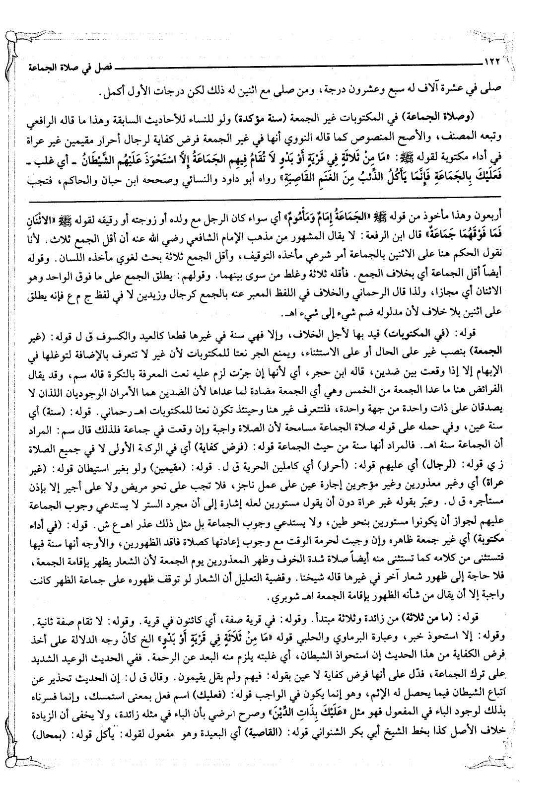(وَصَلَاةُ الْجَمَاعَةِ) فِي الْمَكْتُوبَاتِ غَيْرِ الْجُمُعَةِ (سُنَّةٌ مُؤَكَّدَةٌ) وَلَوْ لِلنِّسَاءِ لِلْأَحَادِيثِ السَّابِقَةِ وَهَذَا مَا قَالَهُ الرَّافِعِيُّ وَتَبِعَهُ الْمُصَنِّفُ، وَالْأَصَحُّ الْمَنْصُوصُ كَمَا قَالَهُ النَّوَوِيُّ أَنَّهَا فِي غَيْرِ الْجُمُعَةِ فَرْضُ كِفَايَةٍ لِرِجَالٍ أَحْرَارٍ مُقِيمِينَ غَيْرِ عُرَاةٍ فِي أَدَاءِ مَكْتُوبَةٍ «لِقَوْلِهِ - صَلَّى اللَّهُ عَلَيْهِ وَسَلَّمَ -: مَا مِنْ ثَلَاثَةٍ مِنْ قَرْيَةٍ أَوْ بَدْوٍ لَا تُقَامُ فِيهِمْ الْجَمَاعَةُ إلَّا اسْتَحْوَذَ عَلَيْهِمْ الشَّيْطَانُ أَيْ غَلَبَ فَعَلَيْك بِالْجَمَاعَةِ فَإِنَّمَا يَأْكُلُ الذِّئْبُ مِنْ الْغَنَمِ الْقَاصِيَةَ» رَوَاهُ أَبُو دَاوُد وَالنَّسَائِيُّ وَصَحَّحَهُ ابْنُ حِبَّانَ وَالْحَاكِمُ، فَتَجِبُ
