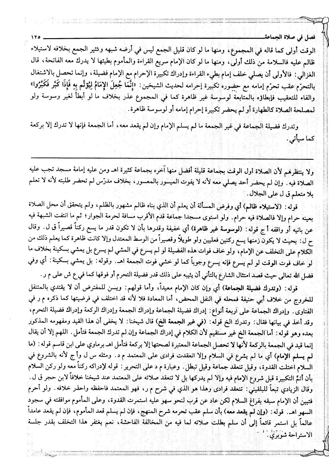 الْوَقْتِ أَوْلَى كَمَا قَالَهُ فِي الْمَجْمُوعِ، وَمِنْهَا مَا لَوْ كَانَ قَلِيلُ الْجَمْعِ لَيْسَ فِي أَرْضِهِ شُبْهَهٌ وَكَثِيرُ الْجَمْعِ بِخِلَافِهِ لِاسْتِيلَاءِ ظَالِمٍ عَلَيْهِ فَالسَّلَامَةُ مِنْ ذَلِكَ أَوْلَى، وَمِنْهَا مَا لَوْ كَانَ الْإِمَامُ سَرِيعَ الْقِرَاءَةِ وَالْمَأْمُومُ بَطِيئَهَا لَا يُدْرِكُ مَعَهُ الْفَاتِحَةَ، قَالَ الْغَزَالِيُّ: فَالْأَوْلَى أَنْ يُصَلِّيَ خَلْفَ إمَامٍ بَطِيءِ الْقِرَاءَةِ وَإِدْرَاكُ تَكْبِيرَةِ الْإِحْرَامِ مَعَ الْإِمَامِ فَضِيلَةٌ، وَإِنَّمَا تَحْصُلُ بِالِاشْتِغَالِ بِالتَّحَرُّمِ عَقِبَ تَحَرُّمِ إمَامِهِ مَعَ حُضُورِهِ تَكْبِيرَةَ إحْرَامِهِ لِحَدِيثِ الشَّيْخَيْنِ: «إنَّمَا جُعِلَ الْإِمَامُ لِيُؤْتَمَّ بِهِ فَإِذَا كَبَّرَ فَكُبِّرُوا» وَالْفَاءُ لِلتَّعْقِيبِ فَإِبْطَاؤُهُ بِالْمُتَابَعَةِ لِوَسْوَسَةٍ غَيْرِ ظَاهِرَةٍ كَمَا فِي الْمَجْمُوعِ عُذْرٌ بِخِلَافِ مَا لَوْ أَبْطَأَ لِغَيْرِ وَسْوَسَةٍ وَلَوْ لِمَصْلَحَةِ الصَّلَاةِ كَالطَّهَارَةِ أَوْ لَمْ يَحْضُرْ تَكْبِيرَةَ إحْرَامِ إمَامِهِ أَوْ لِوَسْوَسَةٍ ظَاهِرَةٍ.