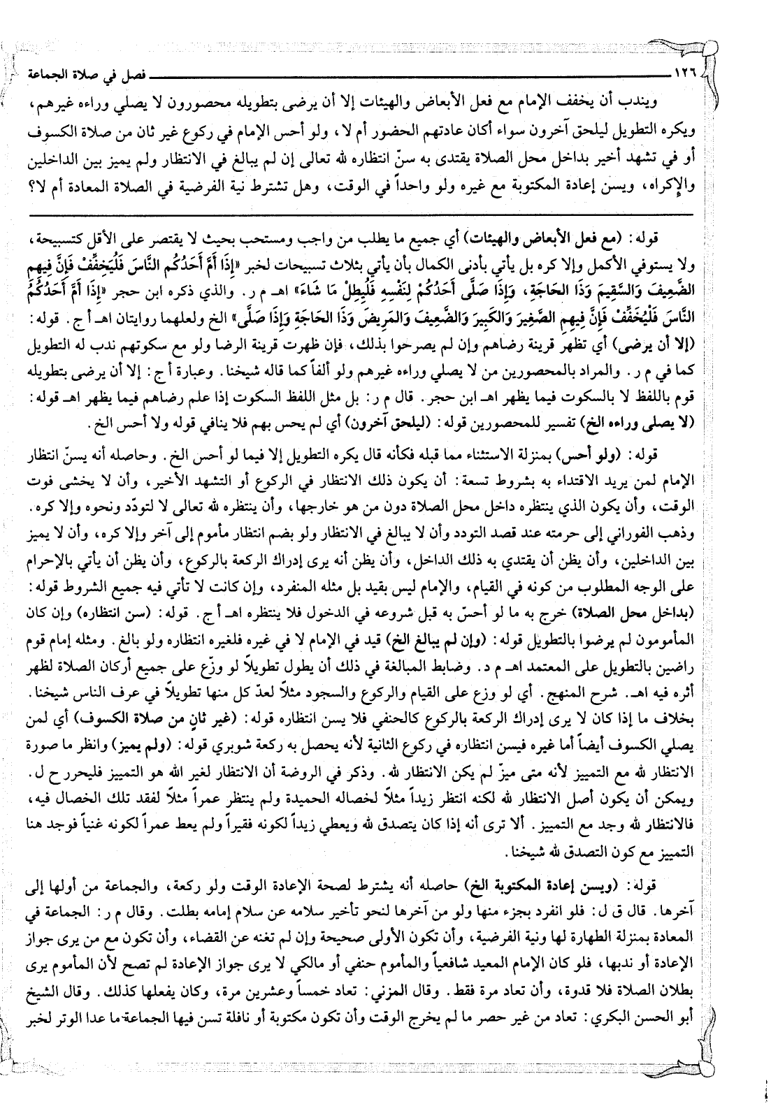 وَيُنْدَبُ أَنْ يُخَفِّفَ الْإِمَامُ مَعَ فِعْلِ الْأَبْعَاضِ وَالْهَيْئَاتِ إلَّا أَنْ يَرْضَى بِتَطْوِيلِهِ مَحْصُورُونَ لَا يُصَلِّي وَرَاءَهُ غَيْرُهُمْ وَيُكْرَهُ التَّطْوِيلُ لِيَلْحَقَ آخَرُونَ سَوَاءٌ أَكَانَ عَادَتُهُمْ الْحُضُورَ أَمْ لَا، وَلَوْ أَحَسَّ الْإِمَامُ فِي رُكُوعٍ غَيْرِ ثَانٍ مِنْ صَلَاةِ الْكُسُوفِ أَوْ فِي تَشَهُّدٍ أَخِيرٍ بِدَاخِلِ مَحَلِّ الصَّلَاةِ يَقْتَدِي بِهِ سُنَّ انْتِظَارُهُ لِلَّهِ تَعَالَى إنْ لَمْ يُبَالِغْ فِي الِانْتِظَارِ وَلَمْ يُمَيِّزْ بَيْنَ الدَّاخِلِينَ وَإِلَّا كُرِهَ، وَيُسَنُّ إعَادَةُ الْمَكْتُوبَةِ مَعَ غَيْرِهِ وَلَوْ وَاحِدًا فِي الْوَقْتِ، وَهَلْ تُشْتَرَطُ نِيَّةُ الْفَرْضِيَّةِ فِي الصَّلَاةِ الْمُعَادَةِ أَمْ لَا؟