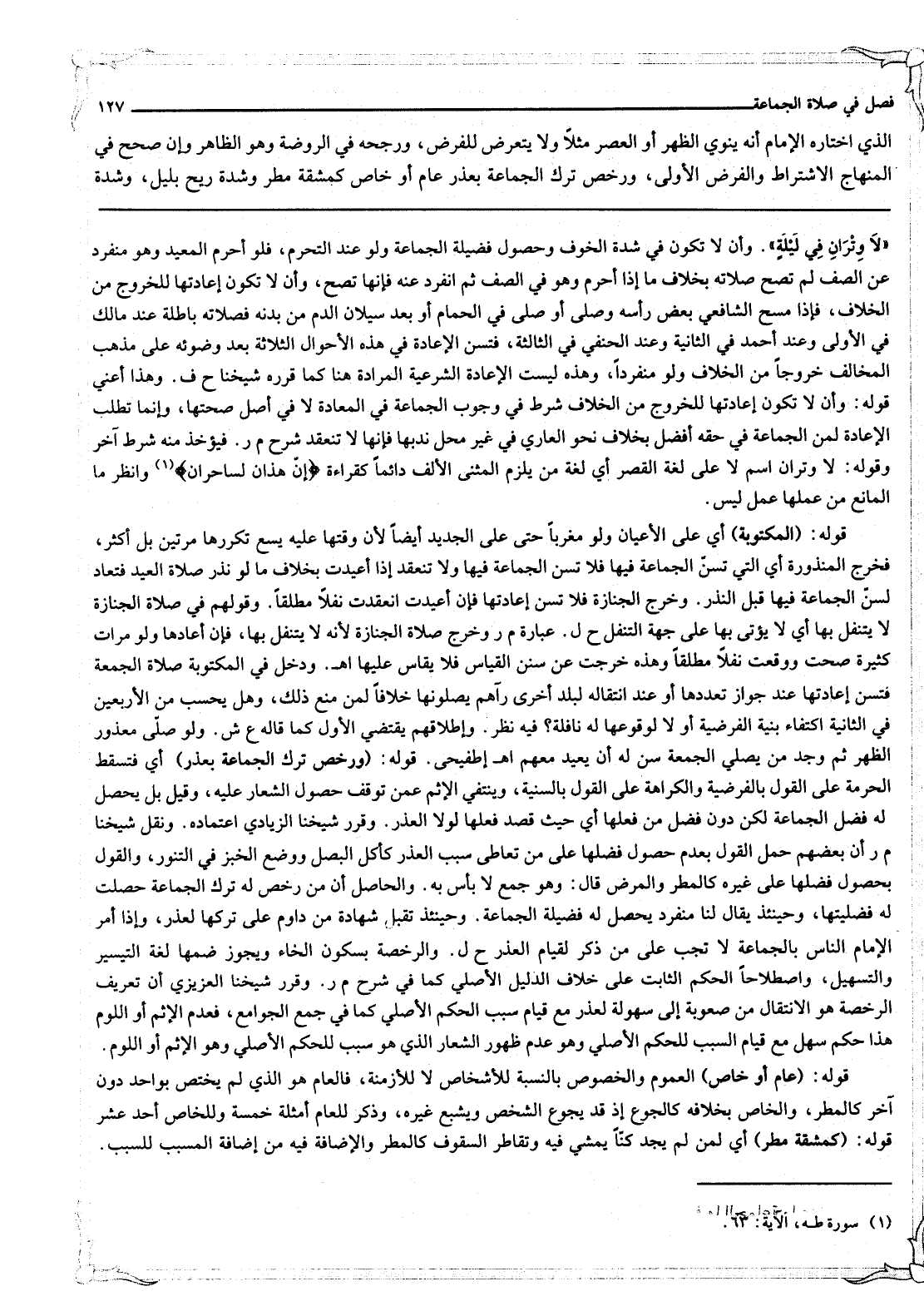 قَوْلُهُ: (وَرُخِّصَ تَرْكُ الْجَمَاعَةِ بِعُذْرٍ) أَيْ فَتَسْقُطُ الْحُرْمَةُ عَلَى الْقَوْلِ بِالْفَرْضِيَّةِ وَالْكَرَاهَةِ عَلَى الْقَوْلِ بِالسُّنِّيَّةِ، وَيَنْتَفِي الْإِثْمُ عَمَّنْ تَوَقَّفَ حُصُولُ الشِّعَارِ عَلَيْهِ، وَقِيلَ بَلْ يَحْصُلُ لَهُ فَضْلُ الْجَمَاعَةِ لَكِنْ دُونَ فَضْلٍ مِنْ فِعْلِهَا أَيْ حَيْثُ قَصَدَ فِعْلَهَا لَوْلَا الْعُذْرُ. وَقَرَّرَ شَيْخُنَا الزِّيَادِيُّ اعْتِمَادَهُ. وَنَقَلَ شَيْخُنَا م ر أَنَّ بَعْضَهُمْ حَمَلَ الْقَوْلَ بِعَدَمِ حُصُولِ فَضْلِهَا عَلَى مَنْ تَعَاطَى سَبَبَ الْعُذْرِ كَأَكْلِ الْبَصَلِ وَوَضْعِ الْخُبْزِ فِي التَّنُّورِ، وَالْقَوْلَ بِحُصُولِ فَضْلِهَا عَلَى غَيْرِهِ كَالْمَطَرِ وَالْمَرَضِ قَالَ: وَهُوَ جَمْعٌ لَا بَأْسَ بِهِ. وَالْحَاصِلُ أَنَّ مِنْ رُخِّصَ لَهُ تَرْكُ الْجَمَاعَةِ حَصَلَتْ لَهُ فَضِيلَتُهَا، وَحِينَئِذٍ يُقَالُ لَنَا مُنْفَرِدٌ يَحْصُلُ لَهُ فَضِيلَةُ الْجَمَاعَةِ. وَحِينَئِذٍ تُقْبَلُ شَهَادَةُ مَنْ دَاوَمَ عَلَى تَرْكِهَا لِعُذْرٍ، وَإِذَا أَمَرَ الْإِمَامُ النَّاسَ بِالْجَمَاعَةِ لَا تَجِبُ عَلَى مَنْ ذُكِرَ لِقِيَامِ الْعُذْرِ ح ل. وَالرُّخْصَةُ بِسُكُونِ الْخَاءِ وَيَجُوزُ ضَمُّهَا لُغَةً التَّيْسِيرُ وَالتَّسْهِيلُ وَاصْطِلَاحًا الْحُكْمُ الثَّابِتُ عَلَى خِلَافِ الدَّلِيلِ الْأَصْلِيِّ كَمَا فِي شَرْحِ م ر. وَقَرَّرَ شَيْخُنَا الْعَزِيزِيُّ أَنَّ تَعْرِيفَ الرُّخْصَةِ هُوَ الِانْتِقَالُ مِنْ صُعُوبَةٍ إلَى سُهُولَةٍ لِعُذْرٍ مَعَ قِيَامِ سَبَبِ الْحُكْمِ الْأَصْلِيِّ كَمَا فِي جَمْعِ الْجَوَامِعِ، فَعَدَمُ الْإِثْمِ أَوْ اللَّوْمِ هَذَا حُكْمٌ سَهْلٌ مَعَ قِيَامِ السَّبَبِ لِلْحُكْمِ الْأَصْلِيِّ وَهُوَ عَدَمُ ظُهُورِ الشِّعَارِ الَّذِي هُوَ سَبَبٌ لِلْحُكْمِ الْأَصْلِيِّ وَهُوَ الْإِثْمُ أَوْ اللَّوْمُ.