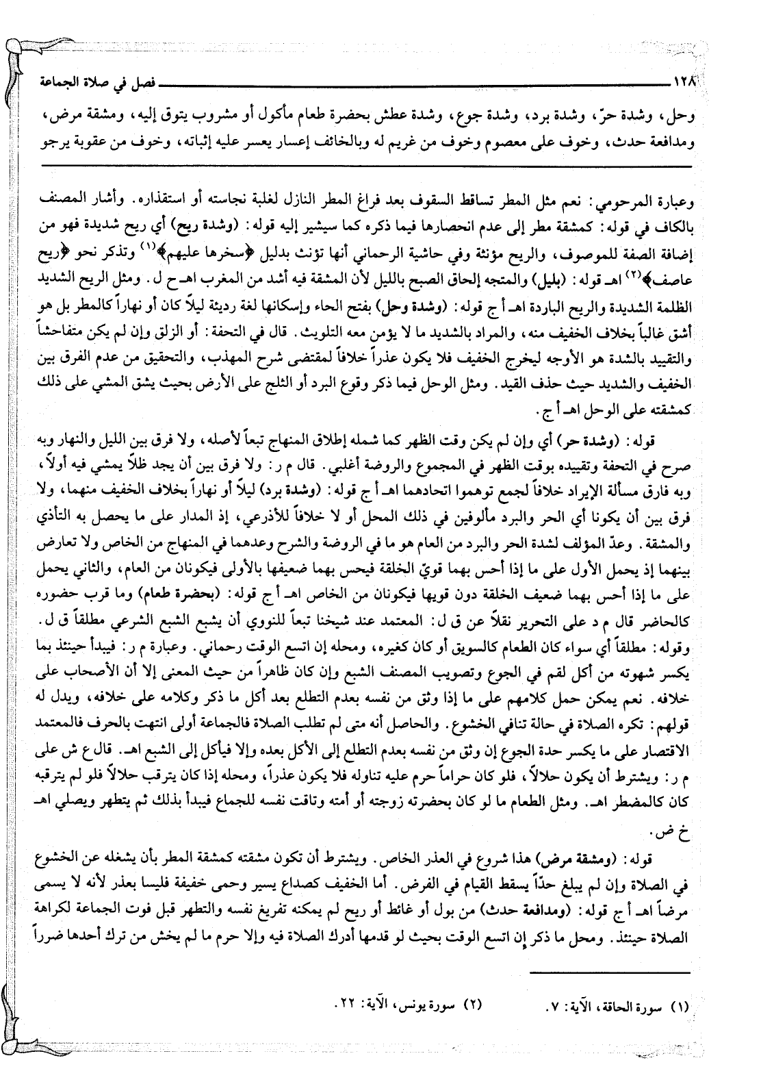ـــــــــــــــــــــــــــــQوَعِبَارَةُ الْمَرْحُومِيِّ: نَعَمْ مِثْلُ الْمَطَرِ تَسَاقُطُ السُّقُوفِ بَعْدَ فَرَاغِ الْمَطَرِ النَّازِلِ لِغَلَبَةِ نَجَاسَتِهِ أَوْ اسْتِقْذَارِهِ. وَأَشَارَ الْمُصَنِّفُ بِالْكَافِ فِي قَوْلِهِ: كَمَشَقَّةِ مَطَرٍ إلَى عَدَمِ انْحِصَارِهَا فِيمَا ذَكَرَهُ كَمَا سَيُشِيرُ إلَيْهِ قَوْلُهُ: (وَشِدَّةُ رِيحٍ) أَيْ رِيحٌ شَدِيدَةٌ فَهُوَ مِنْ إضَافَةِ الصِّفَةِ لِلْمَوْصُوفِ، وَالرِّيحُ مُؤَنَّثَةٌ وَفِي حَاشِيَةِ الرَّحْمَانِيِّ أَنَّهَا تُؤَنَّثُ بِدَلِيلِ {سَخَّرَهَا عَلَيْهِمْ} [الحاقة: 7] وَتُذَكَّرُ نَحْوَ {رِيحٌ عَاصِفٌ} اهـ قَوْلُهُ: (بِلَيْلٍ) وَالْمُتَّجَهُ إلْحَاقُ الصُّبْحِ بِاللَّيْلِ لِأَنَّ الْمَشَقَّةَ فِيهِ أَشَدُّ مِنْ الْمَغْرِبِ اهـ ح ل. وَمِثْلُ الرِّيحِ الشَّدِيدِ الظُّلْمَةُ الشَّدِيدَةُ وَالرِّيحُ الْبَارِدَةُ أهـ أج قَوْلُهُ: (وَشِدَّةِ وَحَلٍ) بِفَتْحِ الْحَاءِ وَإِسْكَانُهَا لُغَةٌ رَدِيئَةٌ لَيْلًا كَانَ أَوْ نَهَارًا كَالْمَطَرِ بَلْ هُوَ أَشَقُّ غَالِبًا بِخِلَافِ الْخَفِيفِ مِنْهُ، وَالْمُرَادُ بِالشَّدِيدِ مَا لَا يُؤْمَنُ مَعَهُ التَّلْوِيثُ. قَالَ فِي التُّحْفَةِ: أَوْ الزَّلَقُ وَإِنْ لَمْ يَكُنْ مُتَفَاحِشًا وَالتَّقْيِيدُ بِالشِّدَّةِ هُوَ الْأَوْجَهُ لِيَخْرُجَ الْخَفِيفُ فَلَا يَكُونُ عُذْرًا خِلَافًا لِمُقْتَضَى شَرْحِ الْمُهَذَّبِ، وَالتَّحْقِيقُ مِنْ عَدَمِ الْفَرْقِ بَيْنَ الْخَفِيفِ وَالشَّدِيدِ حَيْثُ حُذِفَ الْقَيْدُ. وَمِثْلُ الْوَحَلِ فِيمَا ذُكِرَ وُقُوعُ الْبَرَدِ أَوْ الثَّلْجِ عَلَى الْأَرْضِ بِحَيْثُ يَشُقُّ الْمَشْيُ عَلَى ذَلِكَ كَمَشَقَّتِهِ عَلَى الْوَحَلِ اهـ أج.