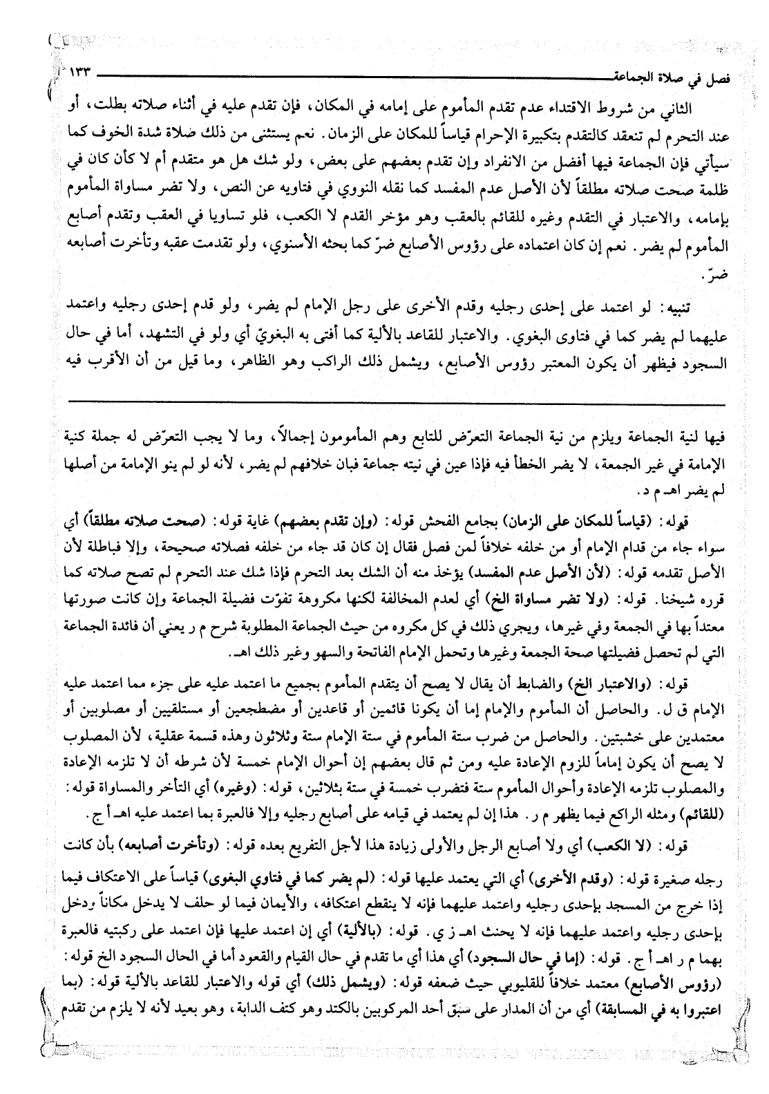 الثَّانِي مِنْ شُرُوطِ الِاقْتِدَاءِ عَدَمُ تَقَدُّمِ الْمَأْمُومِ عَلَى إمَامِهِ فِي الْمَكَانِ، فَإِنْ تَقَدَّمَ عَلَيْهِ فِي أَثْنَاءِ صَلَاتِهِ بَطَلَتْ، أَوْ عِنْدَ التَّحَرُّمِ لَمْ تَنْعَقِدْ كَالتَّقَدُّمِ بِتَكْبِيرَةِ الْإِحْرَامِ قِيَاسًا لِلْمَكَانِ عَلَى الزَّمَانِ. نَعَمْ يُسْتَثْنَى مِنْ ذَلِكَ صَلَاةُ شِدَّةِ الْخَوْفِ كَمَا سَيَأْتِي فَإِنَّ الْجَمَاعَةَ فِيهَا أَفْضَلُ مِنْ الِانْفِرَادِ وَإِنْ تَقَدَّمَ بَعْضُهُمْ عَلَى بَعْضٍ، وَلَوْ شَكَّ هَلْ هُوَ مُتَقَدِّمٌ أَمْ لَا كَأَنْ كَانَ فِي ظُلْمَةٍ صَحَّتْ صَلَاتُهُ مُطْلَقًا لِأَنَّ الْأَصْلَ عَدَمُ الْمُفْسِدِ كَمَا نَقَلَهُ النَّوَوِيُّ فِي فَتَاوِيهِ عَنْ النَّصِّ، وَلَا تَضُرُّ مُسَاوَاةُ الْمَأْمُومِ بِإِمَامِهِ، وَالِاعْتِبَارُ فِي التَّقَدُّمِ وَغَيْرِهِ لِلْقَائِمِ بِالْعَقِبِ وَهُوَ مُؤَخَّرُ الْقَدَمِ لَا الْكَعْبُ، فَلَوْ تَسَاوَيَا فِي الْعَقِبِ وَتَقَدَّمَ أَصَابِعُ الْمَأْمُومِ لَمْ يَضُرَّ. نَعَمْ إنْ كَانَ اعْتِمَادُهُ عَلَى رُءُوسِ الْأَصَابِعِ ضَرَّ كَمَا بَحَثَهُ الْإِسْنَوِيُّ، وَلَوْ تَقَدَّمَتْ عَقِبُهُ وَتَأَخَّرَتْ أَصَابِعُهُ ضَرَّ.