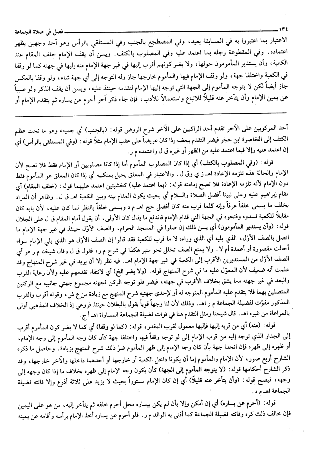وَيُسَنُّ أَنْ يَقِفَ الْإِمَامُ خَلْفَ الْمَقَامِ عِنْدَ الْكَعْبَةِ، وَأَنْ يَسْتَدِيرَ الْمَأْمُومُونَ حَوْلَهَا، وَلَا يَضُرُّ كَوْنُهُمْ أَقْرَبَ إلَيْهَا فِي غَيْرِ جِهَةِ الْإِمَامِ مِنْهُ إلَيْهَا فِي جِهَتِهِ كَمَا لَوْ وَقَفَا فِي الْكَعْبَةِ وَاخْتَلَفَا جِهَةً، وَلَوْ وَقَفَ الْإِمَامُ فِيهَا وَالْمَأْمُومُ خَارِجَهَا جَازَ وَلَهُ التَّوَجُّهُ إلَى أَيِّ جِهَةٍ شَاءَ، وَلَوْ وَقَفَا بِالْعَكْسِ جَازَ أَيْضًا لَكِنْ لَا يَتَوَجَّهُ الْمَأْمُومُ إلَى الْجِهَةِ الَّتِي تَوَجَّهَ إلَيْهَا الْإِمَامُ لِتَقَدُّمِهِ حِينَئِذٍ عَلَيْهِ، وَيُسَنُّ أَنْ يَقِفَ الذَّكَرُ وَلَوْ صَبِيًّا عَنْ يَمِينِ الْإِمَامِ وَأَنْ يَتَأَخَّرَ عَنْهُ قَلِيلًا لِلِاتِّبَاعِ وَاسْتِعْمَالًا لِلْأَدَبِ، فَإِنْ جَاءَ ذَكَرٌ آخَرُ أَحْرَمَ عَنْ يَسَارِهِ ثُمَّ يَتَقَدَّمُ الْإِمَامُ أَوْ