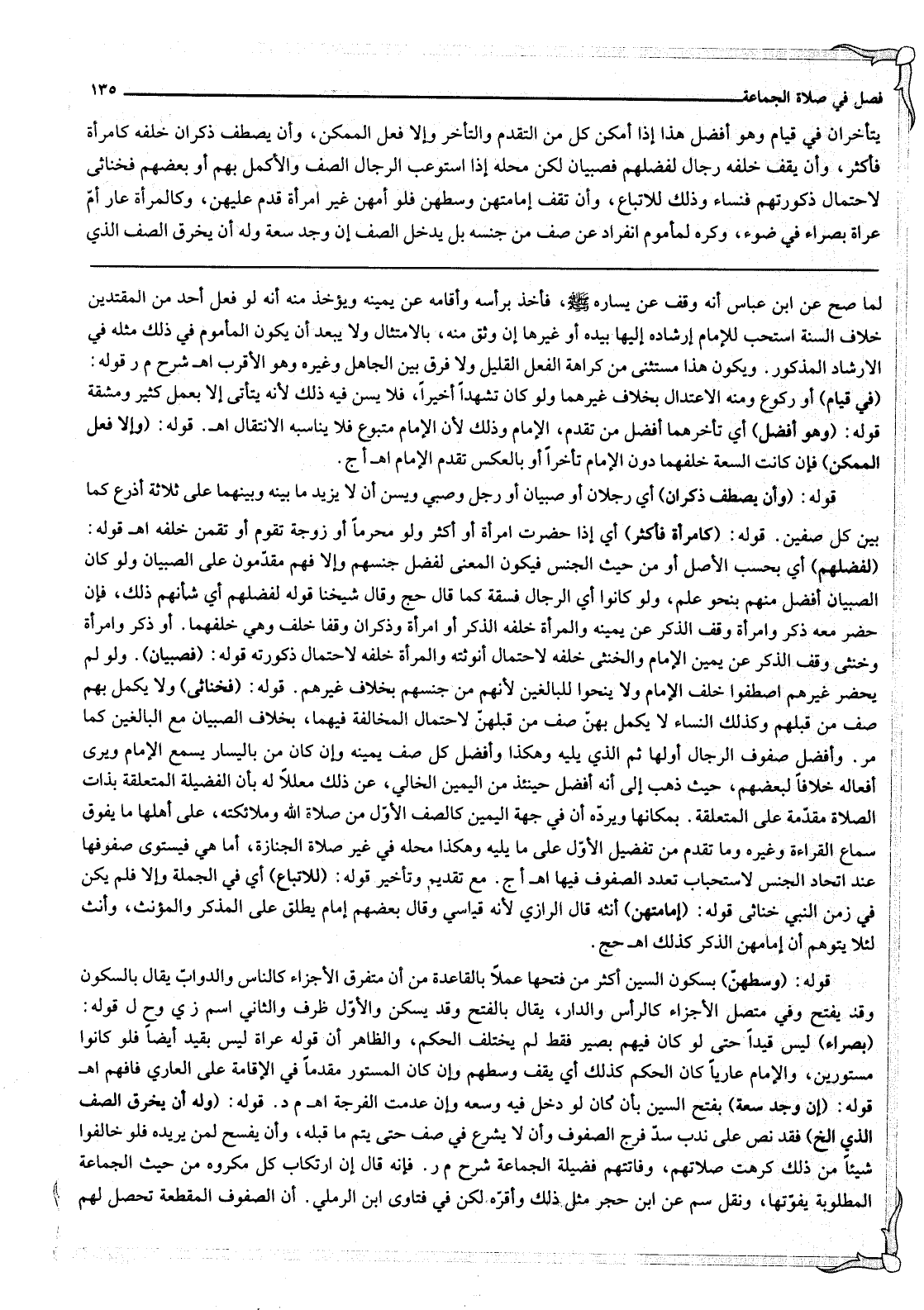 ـــــــــــــــــــــــــــــQلِمَا صَحَّ عَنْ «ابْنِ عَبَّاسٍ أَنَّهُ وَقَفَ عَنْ يَسَارِهِ - صَلَّى اللَّهُ عَلَيْهِ وَسَلَّمَ -، فَأَخَذَ بِرَأْسِهِ وَأَقَامَهُ عَنْ يَمِينِهِ» وَيُؤْخَذُ مِنْهُ أَنَّهُ لَوْ فَعَلَ أَحَدٌ مِنْ الْمُقْتَدِينَ خِلَافَ السُّنَّةِ اُسْتُحِبَّ لِلْإِمَامِ إرْشَادُهُ إلَيْهَا بِيَدِهِ أَوْ غَيْرِهَا إنْ وَثِقَ مِنْهُ، بِالِامْتِثَالِ وَلَا يَبْعُدُ أَنْ يَكُونَ الْمَأْمُومُ فِي ذَلِكَ مِثْلَهُ فِي الْإِرْشَادِ الْمَذْكُورِ. وَيَكُونُ هَذَا مُسْتَثْنًى مِنْ كَرَاهَةِ الْفِعْلِ الْقَلِيلِ وَلَا فَرْقَ بَيْنَ الْجَاهِلِ وَغَيْرِهِ وَهُوَ الْأَقْرَبُ اهـ شَرْحُ م ر.