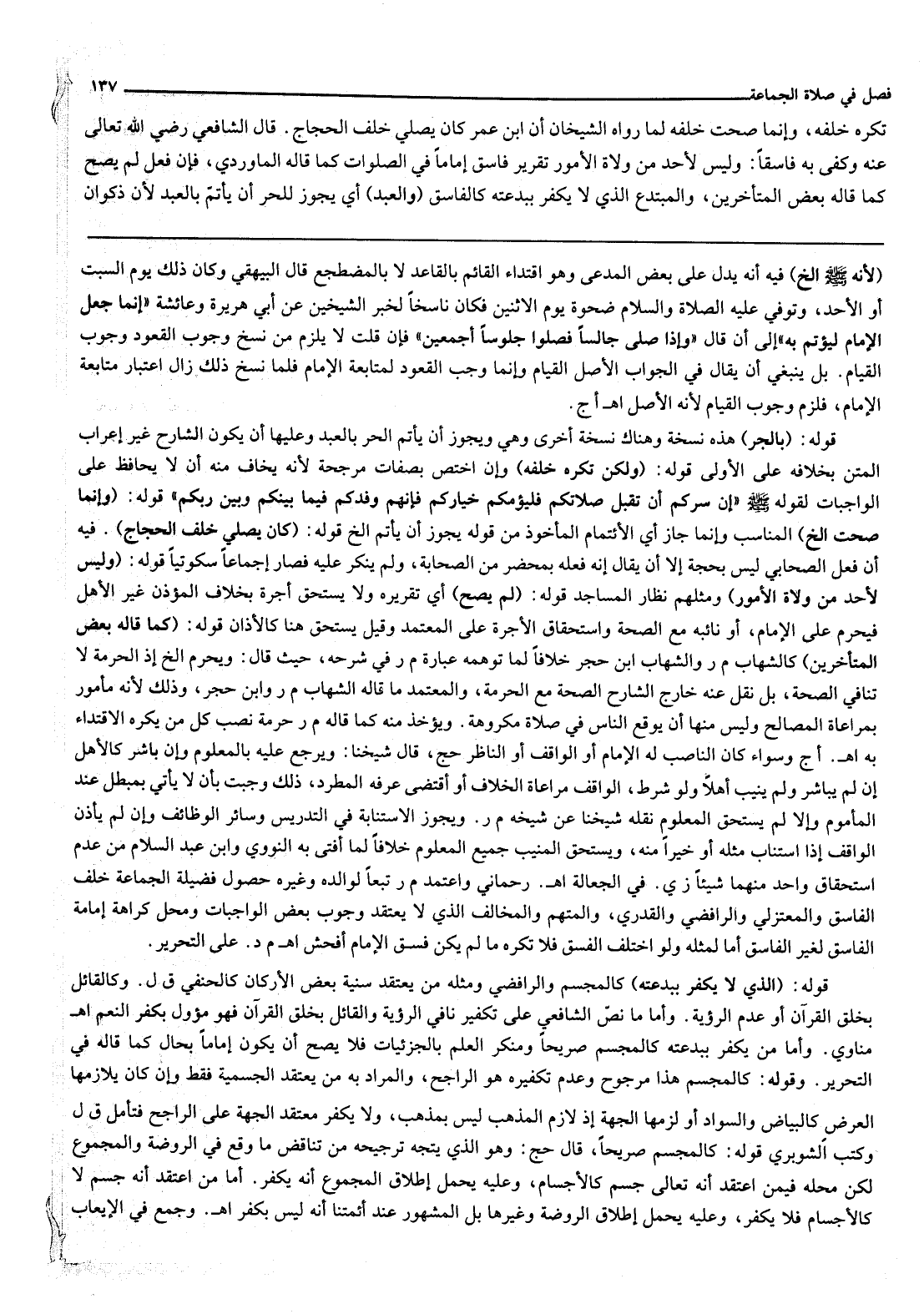 قَوْلُهُ: (الَّذِي لَا يَكْفُرُ بِبِدْعَتِهِ) كَالْمُجَسِّمِ وَالرَّافِضِيِّ وَمِثْلُهُ مَنْ يَعْتَقِدُ سُنِّيَّةَ بَعْضِ الْأَرْكَانِ كَالْحَنَفِيِّ ق ل. وَكَالْقَائِلِ بِخَلْقِ الْقُرْآنِ أَوْ عَدَمِ الرُّؤْيَةِ. وَأَمَّا مَا نَصَّ الشَّافِعِيُّ عَلَى تَكْفِيرِ نَافِي الرُّؤْيَةِ وَالْقَائِلِ بِخَلْقِ الْقُرْآنِ فَهُوَ مُؤَوَّلٌ بِكُفْرِ النِّعَمِ اهـ مُنَاوِيٌّ. وَأَمَّا مَنْ يَكْفُرُ بِبِدْعَتِهِ كَالْمُجَسِّمِ صَرِيحًا وَمُنْكِرِ الْعِلْمِ بِالْجُزْئِيَّاتِ فَلَا يَصِحُّ أَنْ يَكُونَ إمَامًا بِحَالٍ كَمَا قَالَهُ فِي التَّحْرِيرِ.