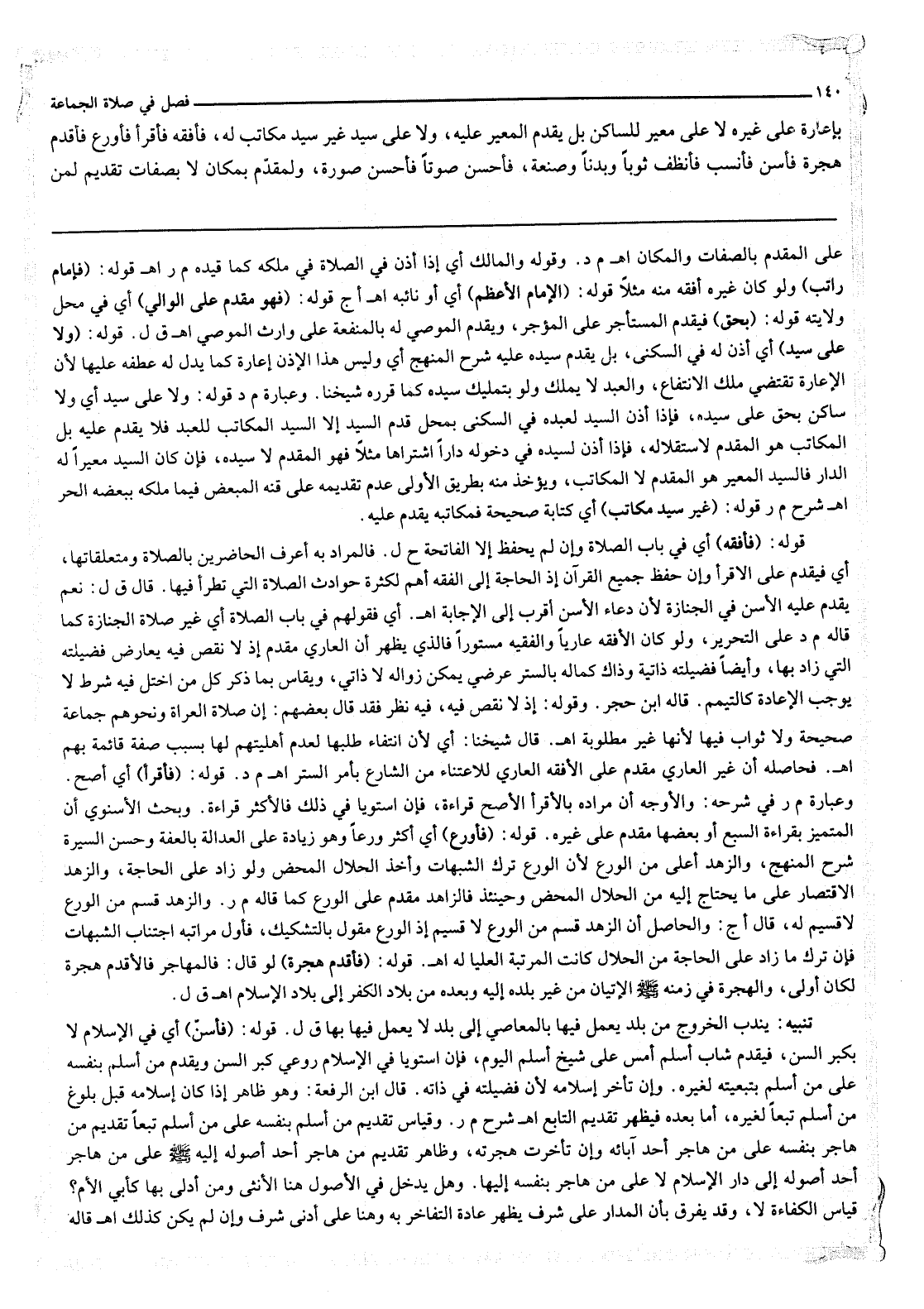 قَوْلُهُ: (فَأَفْقَهُ) أَيْ فِي بَابِ الصَّلَاةِ وَإِنْ لَمْ يَحْفَظْ إلَّا الْفَاتِحَةَ ح ل. فَالْمُرَادُ بِهِ أَعْرَفُ الْحَاضِرِينَ بِالصَّلَاةِ وَمُتَعَلِّقَاتِهَا، أَيْ فَيُقَدَّمُ عَلَى الْأَقْرَأِ وَإِنْ حَفِظَ جَمِيعَ الْقُرْآنِ إذْ الْحَاجَةُ إلَى الْفِقْهِ أَهَمُّ لِكَثْرَةِ حَوَادِثِ الصَّلَاةِ الَّتِي تَطْرَأُ فِيهَا. قَالَ ق ل: نَعَمْ يُقَدَّمُ عَلَيْهِ الْأَسَنُّ فِي الْجِنَازَةِ لِأَنَّ دُعَاءَ الْأَسَنِّ أَقْرَبُ إلَى الْإِجَابَةِ اهـ. أَيْ فَقَوْلُهُمْ فِي بَابِ الصَّلَاةِ أَيْ غَيْرِ صَلَاةِ الْجِنَازَةِ كَمَا قَالَهُ م د عَلَى التَّحْرِيرِ، وَلَوْ كَانَ الْأَفْقَهُ عَارِيًّا وَالْفَقِيهُ مَسْتُورًا فَاَلَّذِي يَظْهَرُ أَنَّ الْعَارِيَ مُقَدَّمٌ إذْ لَا نَقْصَ فِيهِ يُعَارِضُ فَضِيلَتَهُ الَّتِي زَادَ بِهَا، وَأَيْضًا فَضِيلَتُهُ ذَاتِيَّةٌ وَذَاكَ كَمَالُهُ بِالسِّتْرِ عَرَضِيٌّ يُمْكِنُ زَوَالُهُ لَا ذَاتِيٌّ، وَيُقَاسُ بِمَا ذُكِرَ كُلُّ مَنْ اخْتَلَّ فِيهِ شَرْطٌ لَا يُوجِبُ الْإِعَادَةَ كَالتَّيَمُّمِ. قَالَهُ ابْنُ حَجَرٍ وَقَوْلُهُ: إذْ لَا نَقْصَ فِيهِ، فِيهِ نَظَرٌ فَقَدْ قَالَ بَعْضُهُمْ: إنَّ صَلَاةَ الْعُرَاةِ وَنَحْوِهِمْ جَمَاعَةً صَحِيحَةٌ وَلَا ثَوَابَ فِيهَا لِأَنَّهَا غَيْرُ مَطْلُوبَةٍ اهـ.