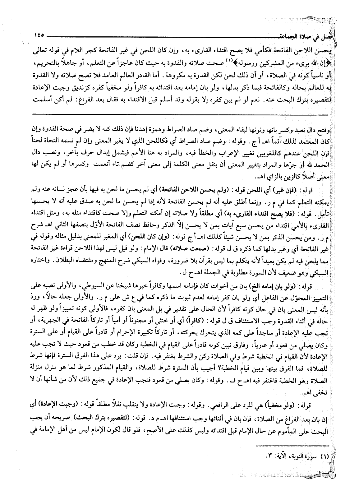 يُحْسِنْ اللَّاحِنُ الْفَاتِحَةَ فَكَأُمِّيٍّ فَلَا يَصِحُّ اقْتِدَاءُ الْقَارِئِ بِهِ، وَإِنْ كَانَ اللَّحْنُ فِي غَيْرِ الْفَاتِحَةِ كَجَرِّ اللَّامِ فِي قَوْله تَعَالَى {أَنَّ اللَّهَ بَرِيءٌ مِنَ الْمُشْرِكِينَ وَرَسُولُهُ} [التوبة: 3] صَحَّتْ صَلَاتُهُ وَالْقُدْوَةُ بِهِ حَيْثُ كَانَ عَاجِزًا عَنْ التَّعَلُّمِ، أَوْ جَاهِلًا بِالتَّحْرِيمِ، أَوْ نَاسِيًا كَوْنَهُ فِي الصَّلَاةِ، أَوْ إنَّ ذَلِكَ لَحْنٌ لَكِنَّ الْقُدْوَةَ بِهِ مَكْرُوهَةٌ. أَمَّا الْقَادِرُ الْعَالِمُ الْعَامِدُ فَلَا تَصِحُّ صَلَاتُهُ وَلَا الْقُدْوَةُ بِهِ لِلْعَالِمِ بِحَالِهِ وَكَالْفَاتِحَةِ فِيمَا ذُكِرَ بَدَلَهَا، وَلَوْ بَانَ إمَامُهُ بَعْدَ اقْتِدَائِهِ بِهِ كَافِرًا وَلَوْ مَخْفِيًّا كُفْرُهُ كَزِنْدِيقٍ وَجَبَتْ الْإِعَادَةُ لِتَقْصِيرِهِ بِتَرْكِ الْبَحْثِ عَنْهُ. نَعَمْ لَوْ لَمْ يَبِنْ كُفْرُهُ إلَّا بِقَوْلِهِ وَقَدْ أَسْلَمَ قَبْلَ الِاقْتِدَاءِ بِهِ فَقَالَ بَعْدَ الْفَرَاغِ: لَمْ أَكُنْ أَسْلَمْت