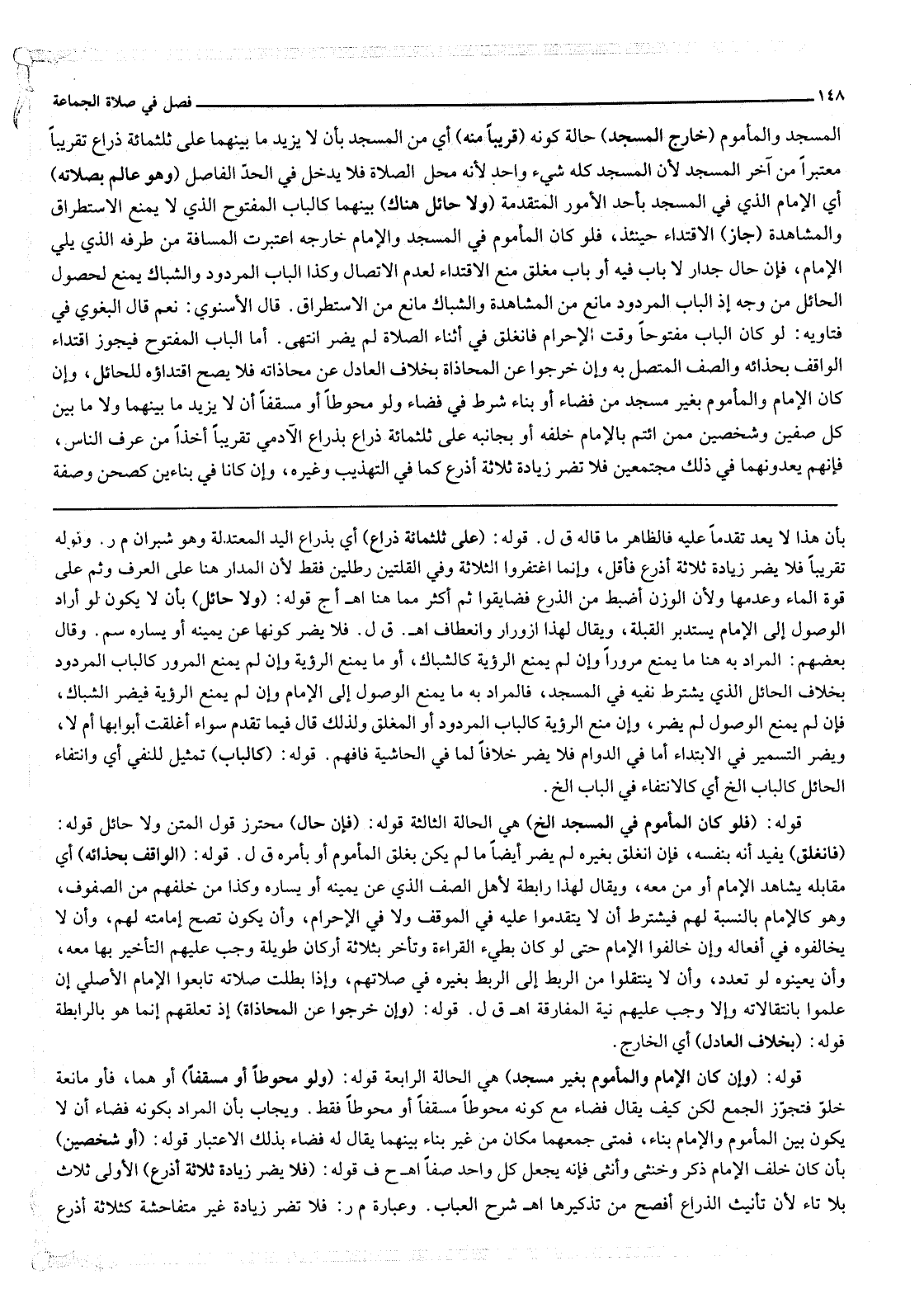 الْمَسْجِدِ وَالْمَأْمُومُ (خَارِجَ الْمَسْجِدِ) حَالَةَ كَوْنِهِ (قَرِيبًا مِنْهُ) أَيْ مِنْ الْمَسْجِدِ بِأَنْ لَا يَزِيدَ مَا بَيْنَهُمَا عَلَى ثَلَثِمِائَةِ ذِرَاعٍ تَقْرِيبًا مُعْتَبَرًا مِنْ آخِرٍ الْمَسْجِدِ لِأَنَّ الْمَسْجِدَ كُلَّهُ شَيْءٌ وَاحِدٌ لِأَنَّهُ مَحَلُّ الصَّلَاةِ فَلَا يَدْخُلُ فِي الْحَدِّ الْفَاصِلِ (وَهُوَ عَالِمٌ بِصَلَاتِهِ) أَيْ الْإِمَامِ الَّذِي فِي الْمَسْجِدِ بِأَحَدِ الْأُمُورِ الْمُتَقَدِّمَةِ (وَلَا حَائِلَ هُنَاكَ) بَيْنَهُمَا كَالْبَابِ الْمَفْتُوحِ الَّذِي لَا يَمْنَعُ الِاسْتِطْرَاقَ وَالْمُشَاهَدَةَ (جَازَ) الِاقْتِدَاءُ حِينَئِذٍ، فَلَوْ كَانَ الْمَأْمُومُ فِي الْمَسْجِدِ وَالْإِمَامُ خَارِجَهُ اُعْتُبِرَتْ الْمَسَافَةُ مِنْ طَرَفِهِ الَّذِي يَلِي الْإِمَامَ، فَإِنْ حَالَ جِدَارٌ لَا بَابَ فِيهِ أَوْ بَابٌ مُغْلَقٌ مُنِعَ الِاقْتِدَاءَ لِعَدَمِ الِاتِّصَالِ وَكَذَا الْبَابُ الْمَرْدُودُ وَالشُّبَّاكُ يَمْنَعُ لِحُصُولِ الْحَائِلِ مِنْ وَجْهٍ إذْ الْبَابُ الْمَرْدُودُ مَانِعٌ مِنْ الْمُشَاهَدَةِ وَالشُّبَّاكُ مَانِعٌ مِنْ الِاسْتِطْرَاقِ. قَالَ الْإِسْنَوِيُّ: نَعَمْ قَالَ الْبَغَوِيّ فِي فَتَاوِيهِ: لَوْ كَانَ الْبَابُ مَفْتُوحًا وَقْتَ الْإِحْرَامِ فَانْغَلَقَ فِي أَثْنَاءِ الصَّلَاةِ لَمْ يَضُرَّ انْتَهَى. أَمَّا الْبَابُ الْمَفْتُوحُ فَيَجُوزُ اقْتِدَاءُ الْوَاقِفِ بِحِذَائِهِ وَالصَّفُّ الْمُتَّصِلُ بِهِ وَإِنْ خَرَجُوا عَنْ. الْمُحَاذَاةِ بِخِلَافِ الْعَادِلِ عَنْ مُحَاذَاتِهِ فَلَا يَصِحُّ اقْتِدَاؤُهُ لِلْحَائِلِ، وَإِنْ كَانَ الْإِمَامُ وَالْمَأْمُومُ بِغَيْرِ مَسْجِدٍ مِنْ فَضَاءٍ أَوْ بِنَاءٍ شُرِطَ فِي فَضَاءٍ وَلَوْ مَحُوطًا أَوْ مُسْقَفًا أَنْ لَا يَزِيدَ مَا بَيْنَهُمَا وَلَا مَا بَيْنَ كُلِّ صَفَّيْنِ وَشَخْصَيْنِ مِمَّنْ ائْتَمَّ بِالْإِمَامِ خَلْفَهُ أَوْ بِجَانِبِهِ عَلَى ثَلَثِمِائَةِ ذِرَاعٍ بِذِرَاعِ الْآدَمِيِّ تَقْرِيبًا أَخْذًا مِنْ عُرْفِ النَّاسِ، فَإِنَّهُمْ يَعُدُّونَهُمَا فِي ذَلِكَ مُجْتَمِعِينَ فَلَا تَضُرُّ زِيَادَةُ ثَلَاثَةِ أَذْرُعٍ كَمَا فِي التَّهْذِيبِ وَغَيْرِهِ، وَإِنْ كَانَا فِي بِنَاءَيْنِ كَصَحْنٍ وَصِفَةٍ