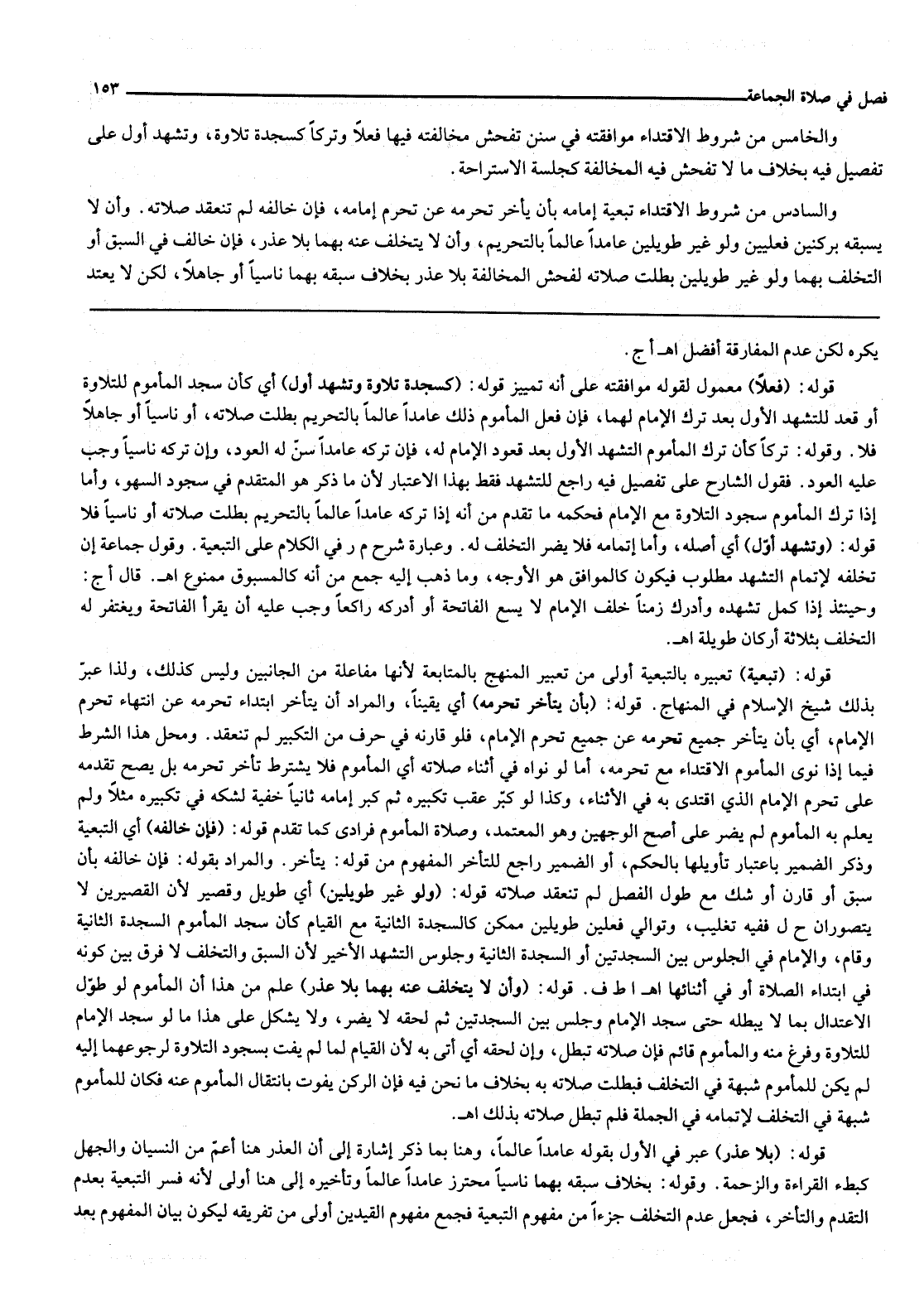 وَالْخَامِسُ مِنْ شُرُوطِ الِاقْتِدَاءِ مُوَافَقَتُهُ فِي سُنَنٍ تَفْحُشُ مُخَالَفَتُهُ فِيهَا فِعْلًا وَتَرْكًا كَسَجْدَةِ تِلَاوَةٍ، وَتَشَهُّدٍ أَوَّلَ عَلَى تَفْصِيلٍ فِيهِ بِخِلَافِ مَا لَا تَفْحُشُ فِيهِ الْمُخَالَفَةُ كَجِلْسَةِ الِاسْتِرَاحَةِ.