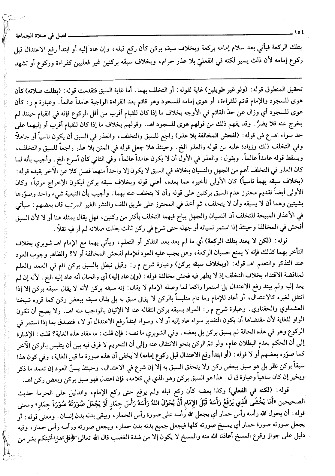 قَوْلُهُ: (لَكِنَّهُ فِي الْفِعْلِيِّ) وَكَذَا بَعْضُهُ كَأَنْ رَكَعَ قَبْلَهُ وَلَمْ يَرْفَعْ حَتَّى رَكَعَ الْإِمَامُ، وَالدَّلِيلُ عَلَى الْحُرْمَةِ حَدِيثُ الصَّحِيحَيْنِ «أَمَا يَخْشَى الَّذِي يَرْفَعُ رَأْسَهُ قَبْلَ الْإِمَامِ أَنْ يُحَوِّلَ اللَّهُ رَأْسَهُ رَأْسَ حِمَارٍ أَوْ يَجْعَلَ صُورَتَهُ صُورَةَ حِمَارٍ» وَمَعْنَى قَوْلِهِ: أَنْ يُحَوِّلَ اللَّهُ رَأْسَهُ رَأْسَ حِمَارٍ أَيْ يَجْعَلُ اللَّهُ رَأْسَهُ عَلَى صُورَةِ رَأْسِ الْحِمَارِ، وَيَبْقَى بَدَنُهُ بَدَنَ إنْسَانٍ. وَمَعْنَى قَوْلِهِ: أَوْ يَجْعَلَ صُورَتَهُ صُورَةَ حِمَارٍ أَيْ يَمْسَخَ صُورَتَهُ كُلَّهَا فَيَجْعَلُ جَمِيعَ بَدَنِهِ بَدَنَ حِمَارٍ، وَيَجْعَلُ صُورَتَهُ وَرَأْسَهُ رَأْسَ حِمَارٍ، وَفِيهِ دَلِيلٌ عَلَى جَوَازِ وُقُوعِ الْمَسْخِ أَعَاذَنَا اللَّهُ مِنْهُ وَالْمَسْخُ لَا يَكُونُ إلَّا مِنْ شِدَّةِ الْغَضَبِ قَالَ اللَّهُ تَعَالَى