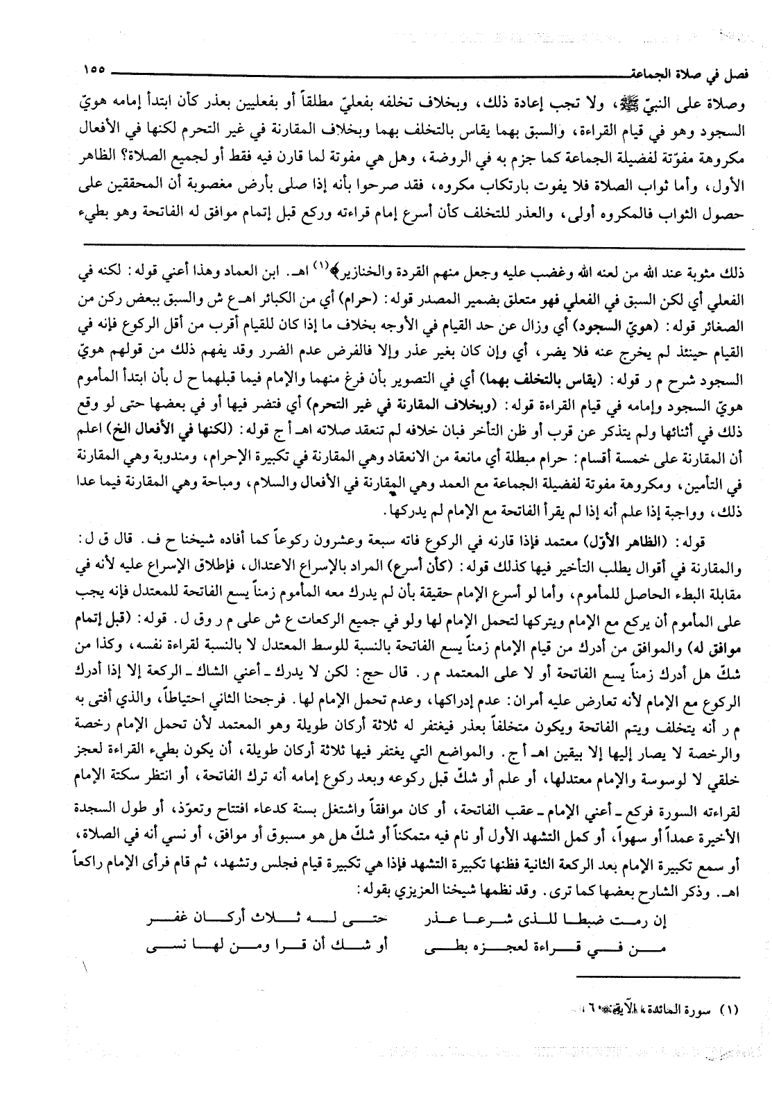 ـــــــــــــــــــــــــــــQ {قُلْ هَلْ أُنَبِّئُكُمْ بِشَرٍّ مِنْ ذَلِكَ مَثُوبَةً عِنْدَ اللَّهِ مَنْ لَعَنَهُ اللَّهُ وَغَضِبَ عَلَيْهِ وَجَعَلَ مِنْهُمُ الْقِرَدَةَ وَالْخَنَازِيرَ} [المائدة: 60] اهـ. ابْنُ الْعِمَادِ وَهَذَا أَعْنِي قَوْلَهُ: لَكِنَّهُ فِي الْفِعْلِيِّ أَيْ لَكِنَّ السَّبَقَ فِي الْفِعْلِيِّ فَهُوَ مُتَعَلِّقٌ بِضَمِيرِ الْمَصْدَرِ قَوْلُهُ: (حَرَامٌ) أَيْ مِنْ الْكَبَائِرِ. اهـ. ع ش وَالسَّبْقُ بِبَعْضِ رُكْنٍ مِنْ الصَّغَائِرِ قَوْلُهُ: (هُوِيَّ السُّجُودِ) أَيْ وَزَالَ عَنْ حَدِّ الْقِيَامِ فِي الْأَوْجَهِ بِخِلَافِ مَا إذَا كَانَ لِلْقِيَامِ أَقْرَبَ مِنْ أَقَلِّ الرُّكُوعِ فَإِنَّهُ فِي الْقِيَامِ حِينَئِذٍ لَمْ يَخْرُجْ عَنْهُ فَلَا يَضُرُّ، أَيْ وَإِنْ كَانَ بِغَيْرِ عُذْرٍ وَإِلَّا فَالْفَرْضُ عَدَمُ الضَّرَرِ وَقَدْ يُفْهَمُ ذَلِكَ مِنْ قَوْلِهِمْ هُوِيَّ السُّجُودِ شَرْحُ م ر قَوْلُهُ: (يُقَاسُ بِالتَّخَلُّفِ بِهِمَا) أَيْ فِي التَّصْوِيرِ بِأَنْ فَرَغَ مِنْهُمَا وَالْإِمَامُ فِيمَا قَبْلَهُمَا ح ل بِأَنْ ابْتَدَأَ الْمَأْمُومُ هُوِيَّ السُّجُودِ وَإِمَامُهُ فِي قِيَامِ الْقِرَاءَةِ قَوْلُهُ: (وَبِخِلَافِ الْمُقَارَنَةِ فِي غَيْرِ التَّحَرُّمِ) أَيْ فَتَضُرُّ فِيهَا أَوْ فِي بَعْضِهَا حَتَّى لَوْ وَقَعَ ذَلِكَ فِي أَثْنَائِهَا وَلَمْ يَتَذَكَّرْ عَنْ قُرْبٍ أَوْ ظَنَّ التَّأَخُّرَ فَبَانَ خِلَافُهُ لَمْ تَنْعَقِدْ صَلَاتُهُ اهـ أج قَوْلُهُ: (لَكِنَّهَا فِي الْأَفْعَالِ إلَخْ) اعْلَمْ أَنَّ الْمُقَارَنَةَ عَلَى خَمْسَةِ أَقْسَامٍ: حَرَامٌ مُبْطِلَةٌ أَيْ مَانِعَةٌ مِنْ الِانْعِقَادِ وَهِيَ الْمُقَارَنَةُ فِي تَكْبِيرَةِ الْإِحْرَامِ، وَمَنْدُوبَةٌ وَهِيَ الْمُقَارَنَةُ فِي التَّأْمِينِ، وَمَكْرُوهَةٌ مُفَوِّتَةٌ لِفَضِيلَةِ الْجَمَاعَةِ مَعَ الْعَمْدِ وَهِيَ الْمُقَارَنَةُ فِي الْأَفْعَالِ وَالسَّلَامِ، وَمُبَاحَةٌ وَهِيَ الْمُقَارَنَةُ فِيمَا عَدَا ذَلِكَ، وَوَاجِبَةٌ إذَا عَلِمَ أَنَّهُ إذَا لَمْ يَقْرَأْ الْفَاتِحَةَ مَعَ الْإِمَامِ لَمْ يُدْرِكْهَا.