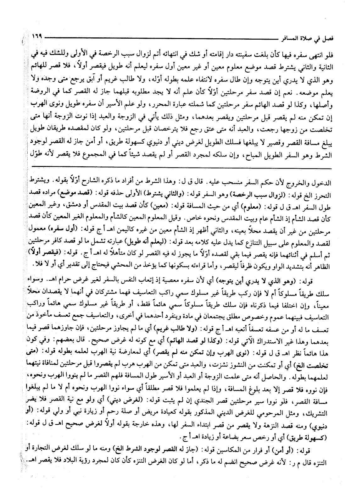 قَوْلُهُ: (وَهُوَ الَّذِي لَا يَدْرِي أَيْنَ يَتَوَجَّهُ) أَيْ لِأَنَّ سَفَرَهُ مَعْصِيَةٌ إذْ إتْعَابُ النَّفْسِ بِالسَّفَرِ لِغَيْرِ غَرَضٍ حَرَامٌ اهـ. وَسَوَاءٌ سَلَكَ طَرِيقًا مَسْلُوكًا أَمْ لَا فَإِنْ رَكِبَ طَرِيقًا غَيْرَ مَسْلُوكٍ سُمِّيَ رَاكِبَ التَّعَاسِيفِ فَهُمَا مُشْتَرِكَانِ فِي أَنَّهَا لَا يَقْصِدَانِ مَحَلًّا مُعَيَّنًا، وَإِنْ اخْتَلَفَا فِيمَا ذَكَرْنَاهُ فَإِنْ سَلَكَ طَرِيقًا مَسْلُوكًا سُمِّيَ هَائِمًا فَقَطْ، أَوْ طَرِيقًا غَيْرَ مَسْلُوكٍ سُمِّيَ هَائِمًا وَرَاكِبَ التَّعَاسِيفِ فَبَيْنَهُمَا عُمُومٌ وَخُصُوصٌ مُطْلَقٌ يَجْتَمِعَانِ فِي مَادَّةٍ وَيَنْفَرِدُ أَحَدُهُمَا فِي أُخْرَى، وَالتَّعَاسِيفُ جَمْعُ تَعَسُّفٍ مَأْخُوذٌ مِنْ تَعَسَّفَ مَالَهُ أَوْ مِنْ عَسَّفَهُ تَعَسُّفًا أَتْعَبَهُ اهـ أج قَوْلُهُ: (وَلَا طَالِبَ غَرِيمٍ) أَيْ مَا لَمْ يُجَاوِزْ مَرْحَلَتَيْنِ، فَإِنْ جَاوَزَهُمَا قَصَرَ فِيمَا بَعْدَهُمَا وَهَذَا غَيْرُ الِاسْتِدْرَاكِ الْآتِي قَوْلُهُ: (وَكَذَا لَوْ قَصَدَ الْهَائِمُ) أَيْ مَعَ كَوْنِهِ لَهُ غَرَضٌ صَحِيحٌ. قَالَ بَعْضُهُمْ: وَفِي كَوْنِ هَذَا هَائِمًا نَظَرٌ. اهـ. ق ل قَوْلُهُ: (نَوَى الْهَرَبَ وَإِنْ تَمَكَّنَ مِنْهُ لَمْ يَقْصُرْ) أَيْ لِمُعَارَضَةِ نِيَّةِ الْهَرَبِ لِعِلْمِهِ بِطُولِهِ قَوْلُهُ: (مَتَى تَخَلَّصَتْ إلَخْ) أَيْ أَوْ تَمَكَّنَتْ مِنْ النُّشُوزِ نَشَزَتْ، وَالْعَبْدُ مَتَى تَمَكَّنَ مِنْ الْهَرَبِ هَرَبَ لَمْ يَقْصُرُوا قَبْلَ مَرْحَلَتَيْنِ لِمُنَافَاةِ نِيَّتِهِمَا لِعِلْمِهِمَا بِطُولِهِ. وَالْحَاصِلُ أَنَّهُ مَتَى عَلِمَتْ الزَّوْجَةُ أَوْ الْعَبْدُ أَوْ الْأَسِيرُ طُولَ الْمَسَافَةِ فَلَهُمْ الْقَصْرُ مَا لَمْ يَنْوُوا الْهَرَبَ وَنَحْوَهُ، فَإِنْ نَوَوْهُ فَلَا قَصْرَ إلَّا بَعْدَ بُلُوغِ الْمَسَافَةِ، وَإِذَا لَمْ يَعْلَمُوا فَلَا قَصْرَ مُطْلَقًا أَيْ سَوَاءٌ نَوَوْا الْهَرَبَ وَنَحْوَهُ أَمْ لَا مَا لَمْ يَبْلُغُوا مَسَافَةَ الْقَصْرِ، فَلَوْ نَوَوْا سَيْرَ مَرْحَلَتَيْنِ قَصَرَ الْجُنْدِيُّ إنْ لَمْ يُثْبَتْ قَوْلُهُ: (لِغَرَضٍ دِينِيٍّ) أَيْ وَلَوْ مَعَ نِيَّةِ الْقَصْرِ فَلَا يَضُرُّ التَّشْرِيكُ، وَمَثَّلَ الْمَرْحُومِيُّ لِلْغَرَضِ الدِّينِيِّ الْمَذْكُورِ بِقَوْلِهِ كَعِيَادَةِ مَرِيضٍ أَوْ صِلَةِ رَحِمٍ أَوْ زِيَارَةِ نَبِيٍّ أَوْ وَلِيٍّ قَوْلُهُ: (أَوْ دُنْيَوِيٍّ) وَمِنْهُ قَصْدُ النُّزْهَةِ وَلَا يَقْصُرُ مَنْ قَصَرَ ابْتِدَاءَ السَّفَرِ لَهَا، وَهَذِهِ خَارِجَةٌ بِقَوْلِهِ أَوَّلًا لِغَرَضٍ صَحِيحٍ. اهـ. ق ل قَوْلُهُ: (كَسُهُولَةِ طَرِيقٍ) أَيْ أَوْ رُخْصِ سِعْرِ بِضَاعَةٍ أَوْ زِيَادَةٍ اهـ أج.